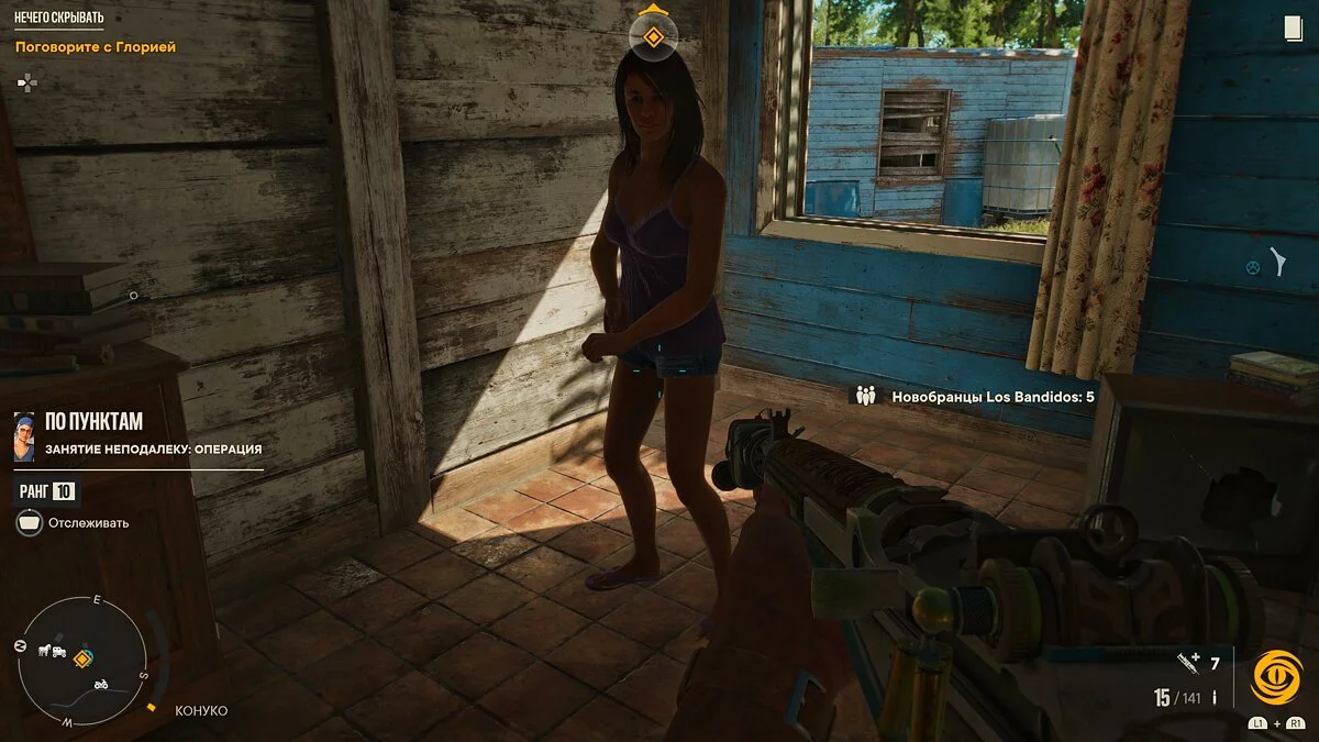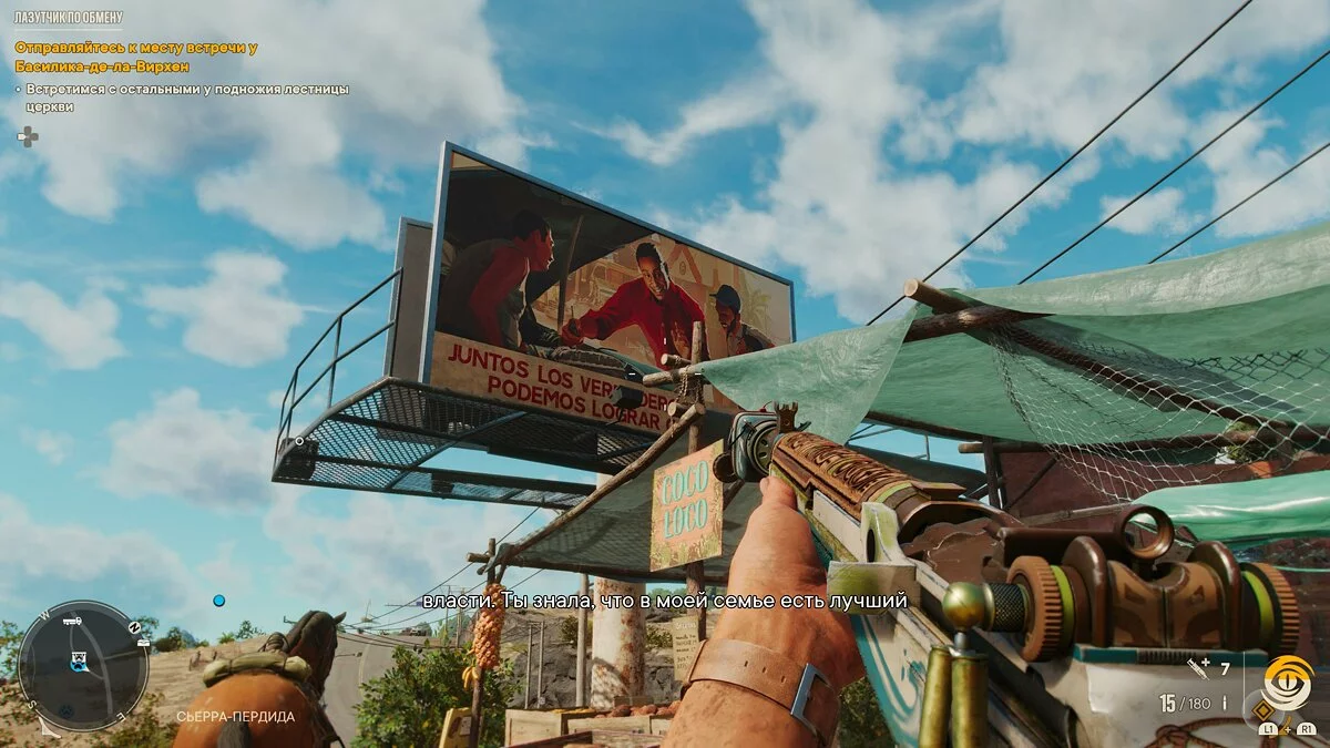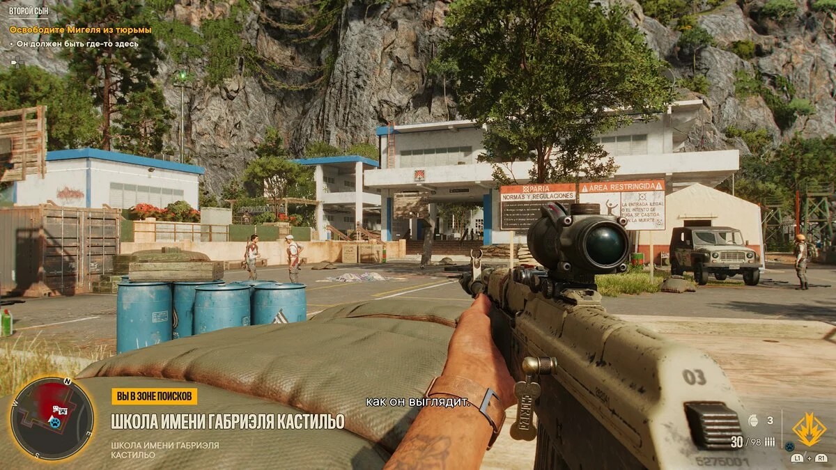 Разговариваем с Хуаном и отправляемся к маркеру. Спускаемся вниз по дороге и забираемся на лошадь. Следуем по главной дороге и добираемся до вражеского КПП. Уничтожаем солдат, разрушаем билборд и двигаемся к радиовышке. Находим Райсу и получаем от неё новые указания. Идём следом за девушкой и подкупаем военного. Предварительно необходимо убрать оружие, иначе он нападёт на игрока.