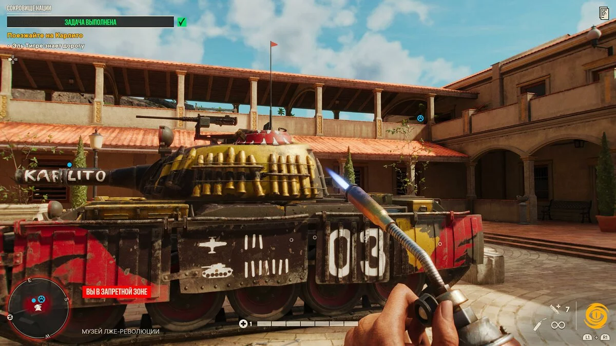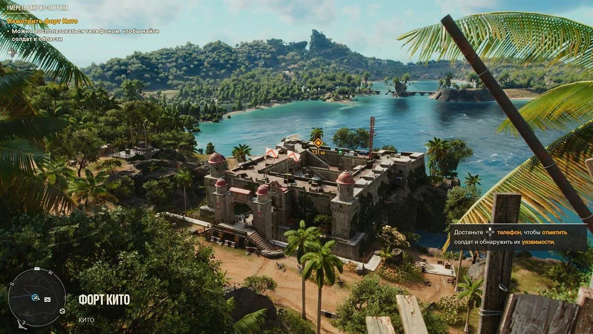 Активируем задание в лагере La Moral и перемещаемся в самую крайнюю юго-восточную точку острова для встречи с Эль Тигре. Перед этим рекомендуется установить наилучшее снаряжение, а также взять с собой инъектор с лекарством (устанавливается в супрэмо). Атакуем с повстанцами форт Бенитес. Двигаемся рядом с танком и чиним его время от времени. В первом дворике можем забрать уран из ящика, а в третьем — уничтожить зенитное орудие.