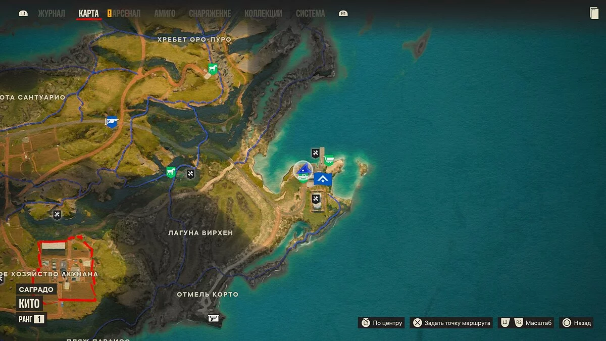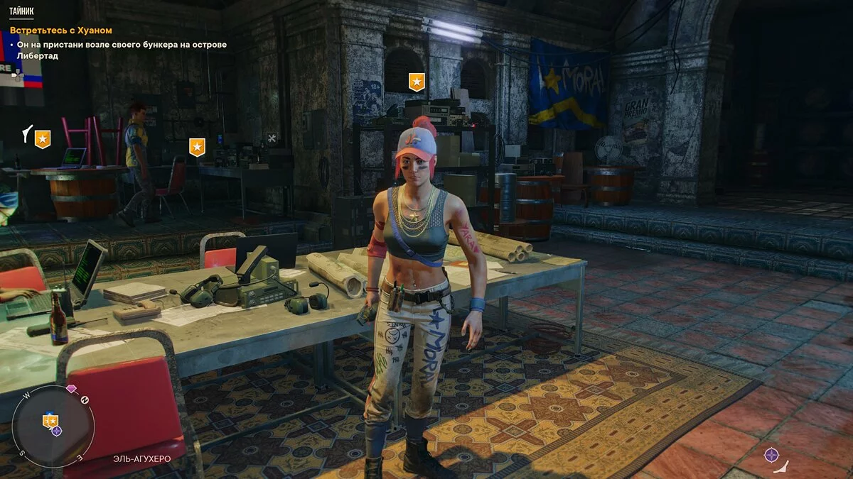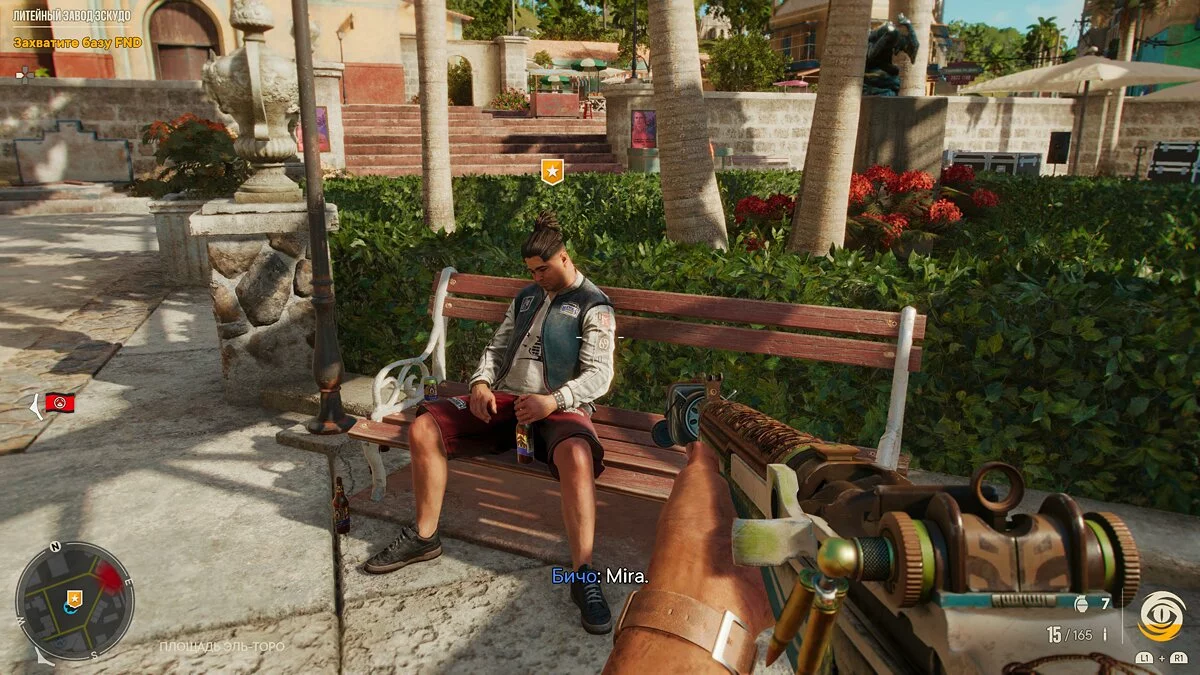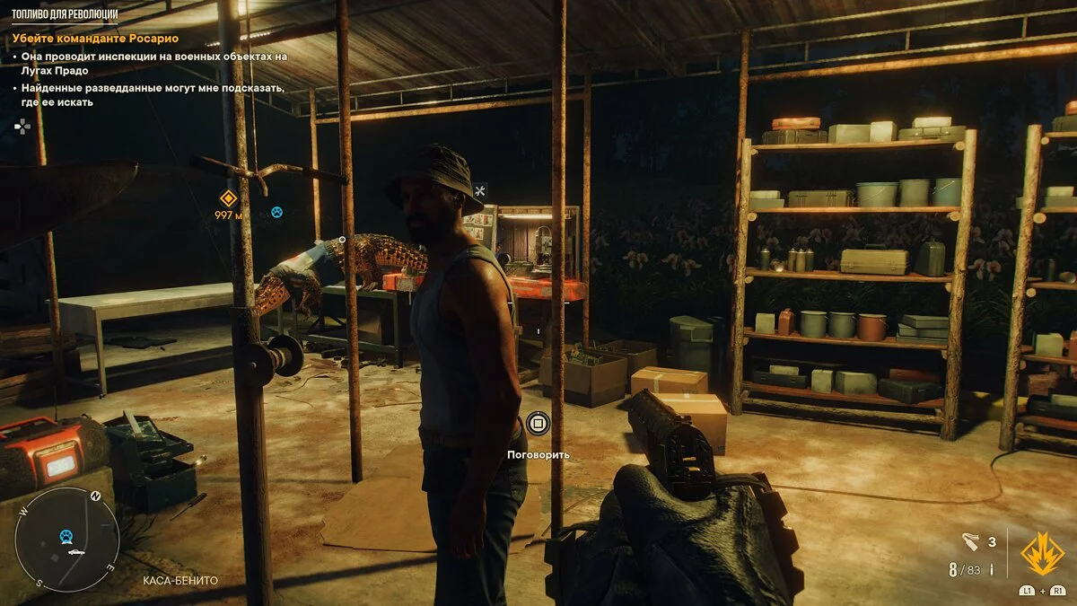 После выполнения задания дождитесь звонка от Клары, в котором девушка попросит найти Бенито. Следуем к указанной на карте точке и разговариваем с мужчиной. Вызываем транспорт и отправляемся к маркеру в северо-западную часть острова. Пробираться придётся через толпы вражеских солдат. Они хорошо вооружены и опасны, поэтому будьте бдительны и избегайте открытых конфликтов. На скриншоте ниже указано точное местоположение вражеского командира.