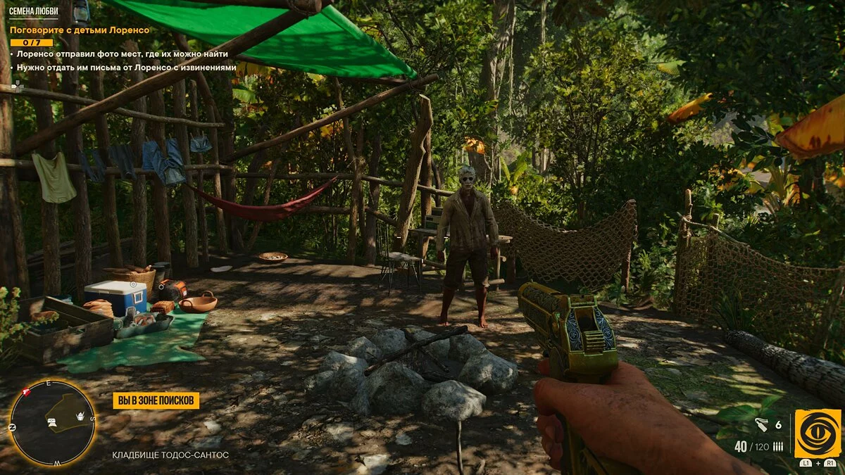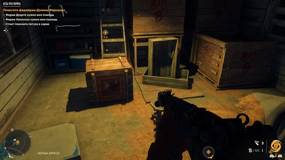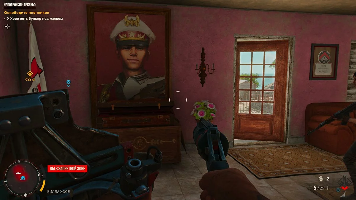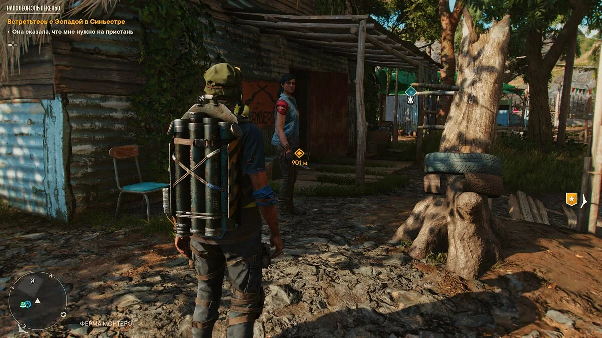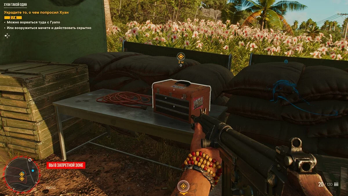 Принимаем задание у Алехандро и отправляемся к метке. Уничтожаем солдат и забираем мачете со стола. Тут же рядом находится контейнер с уникальным пистолетом-пулемётом «ПП-Арт». Возвращаемся на ферму Монтеро для завершения задания.