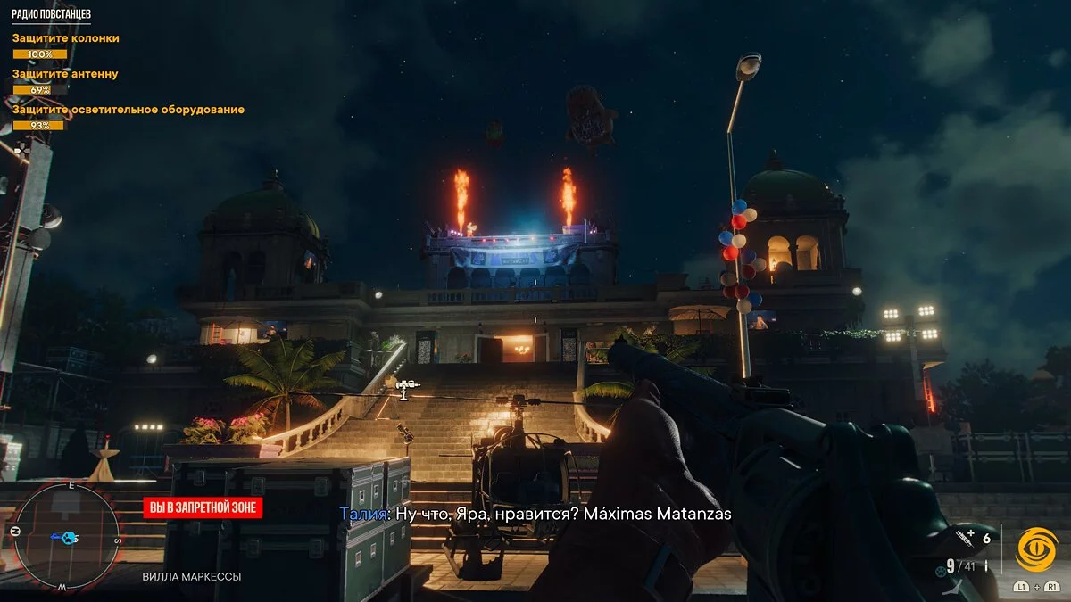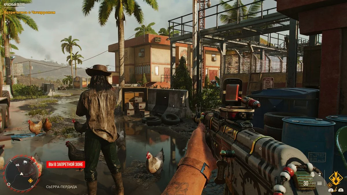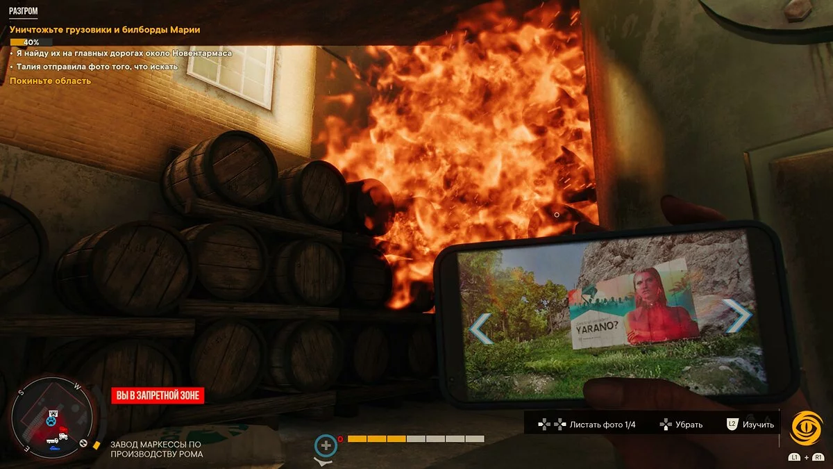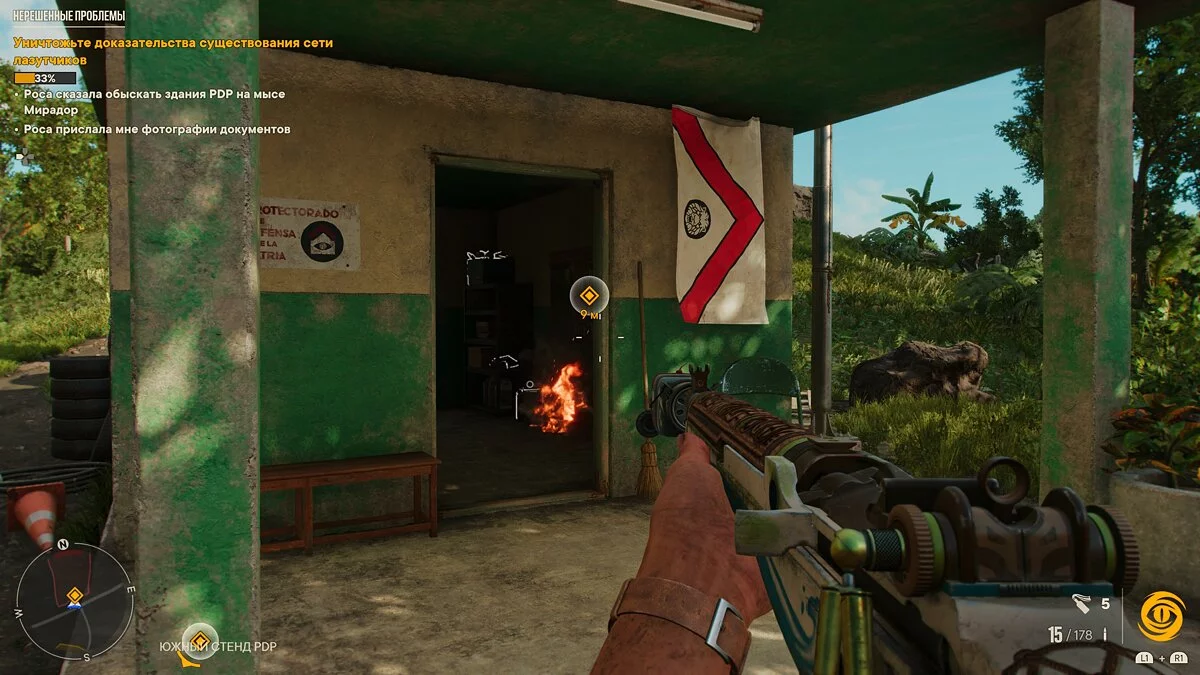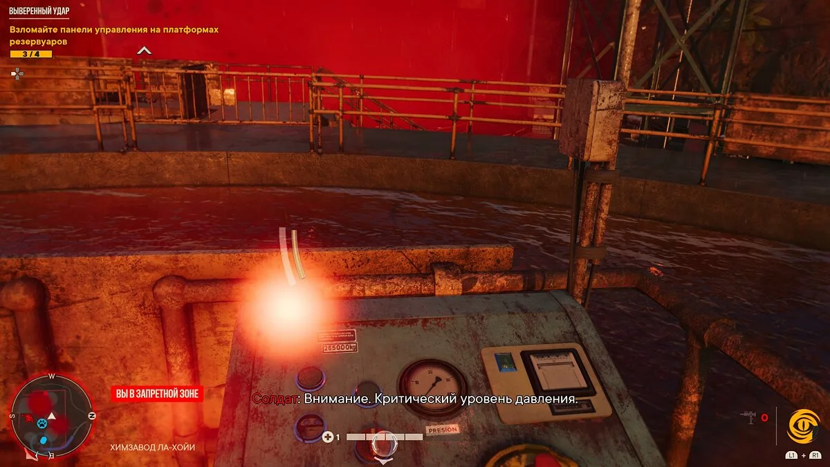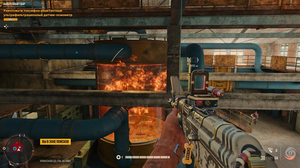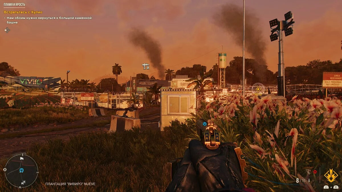 Уничтожаем баки с топливом из оружия, а также взрываем большие жёлтые контейнеры. Используем «Тостадор», чтобы поджечь поля с красным табаком. Как только полоска прогресса заполнится до 100%, возвращаемся к каменной башне для разговора с Хулио.