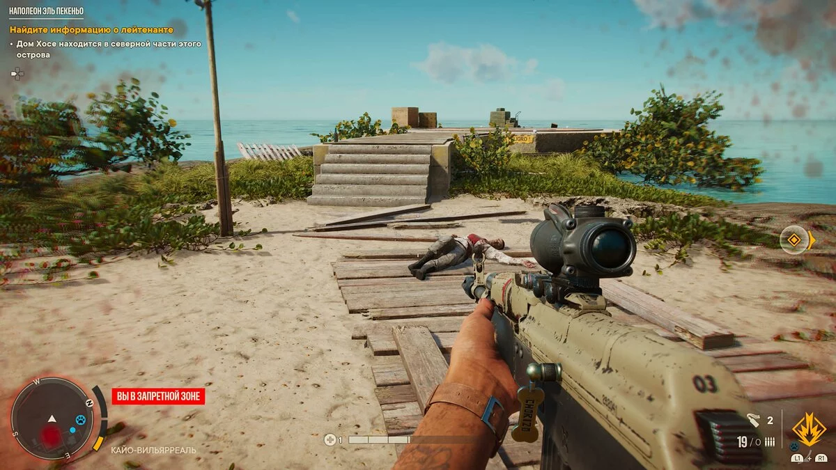 Отправляемся к указанной метке и встречаемся с Эспадой. Доплываем на лодке до Кайо-Вильярреал. Перебить на острове всех невозможно, поэтому стараемся действовать скрытно.