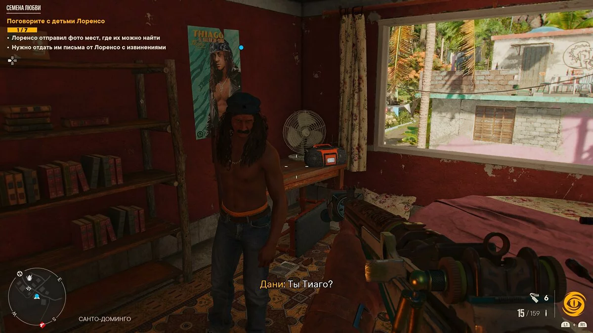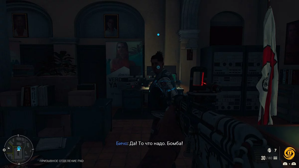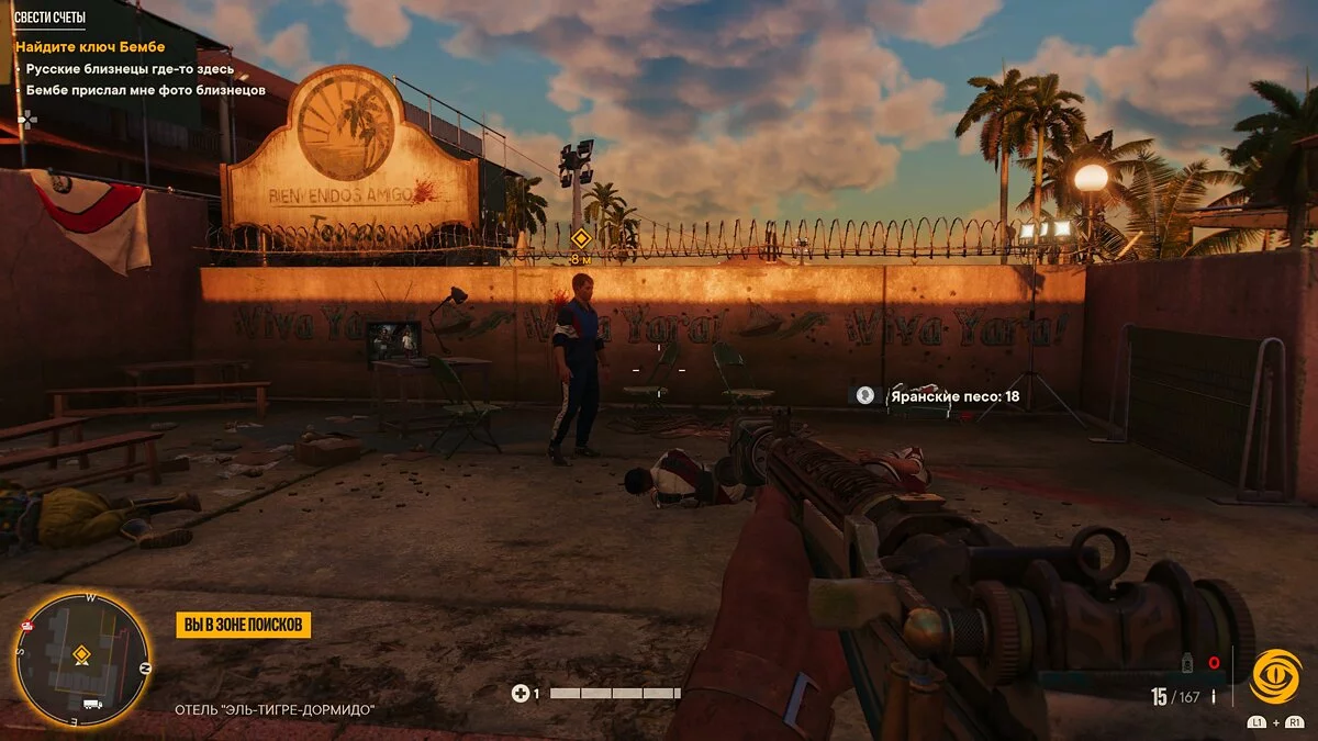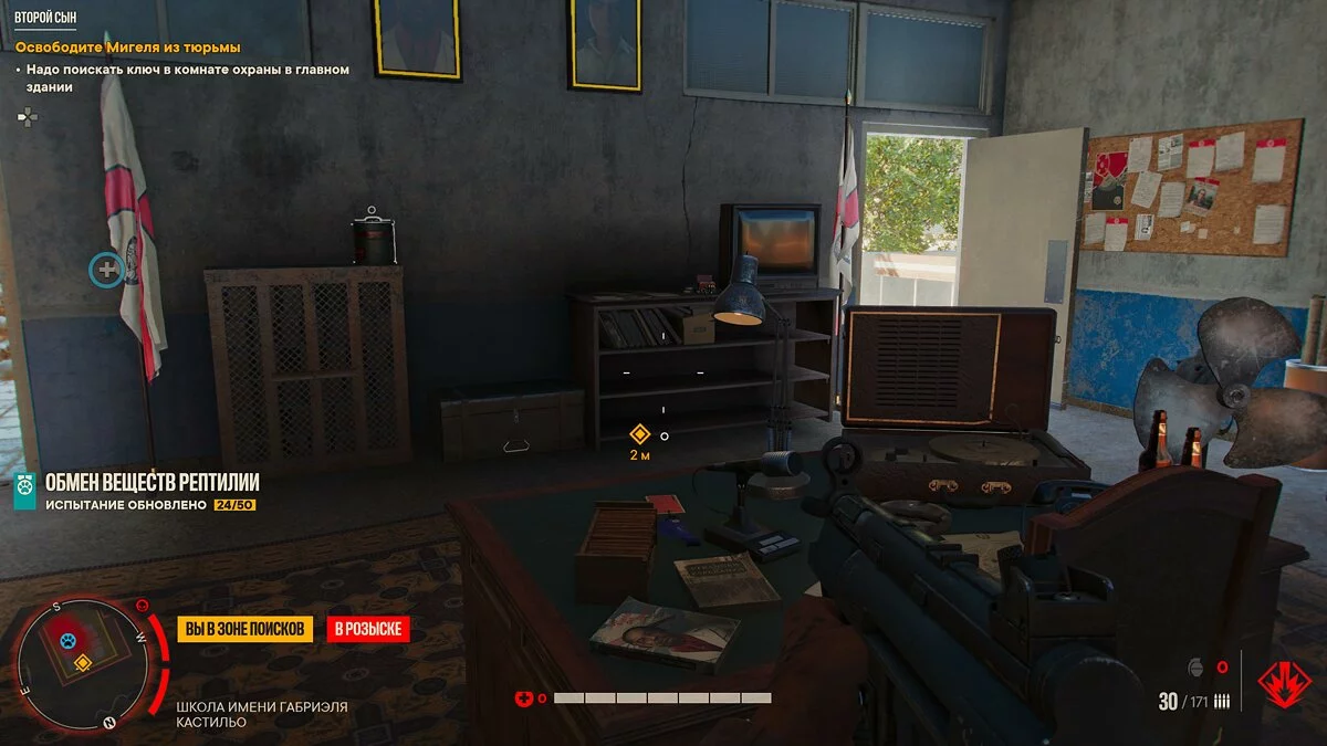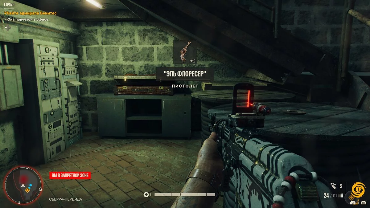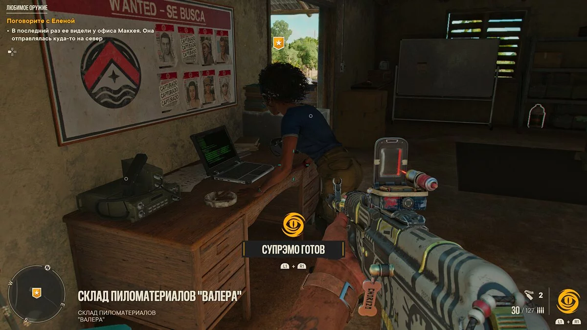 После зачистки территории подходим к телу Росарио, чтобы подобрать ключ-карту от запертого тайника. Следуем в закрытое помещение, применяем найденную карточку и забираем уникальный автоматический пистолет «Эль Генерал». Покидаем вражескую территорию для завершения задания.