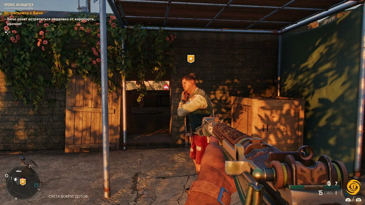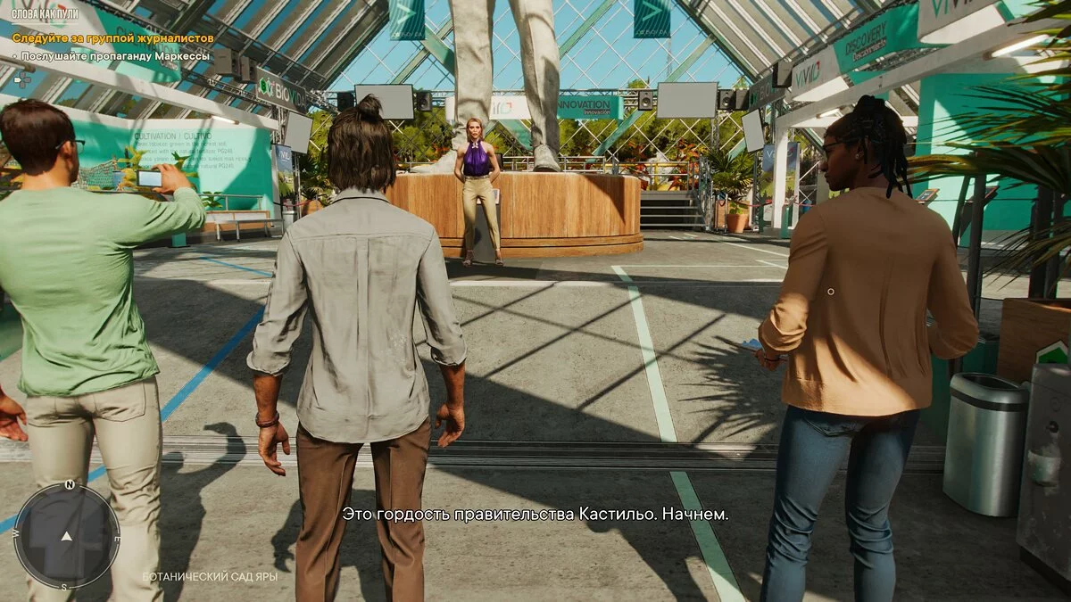 Следуем к маркеру и разговариваем с мужчиной в кепке. Бежим за ним через полигон и всегда наводим камеру на него.