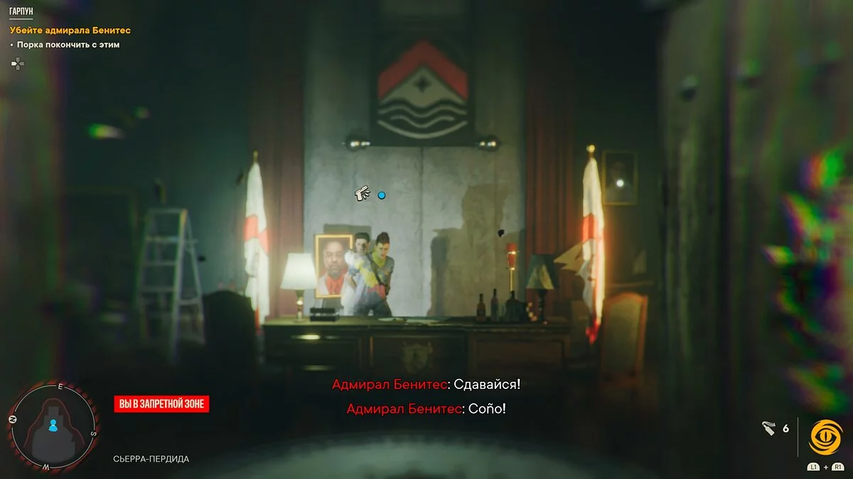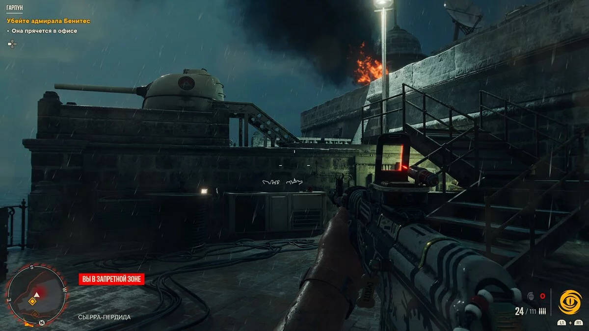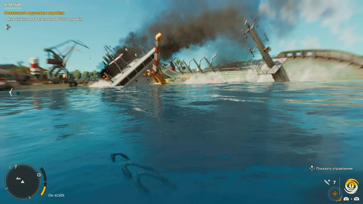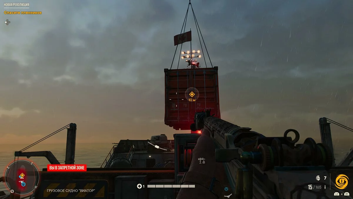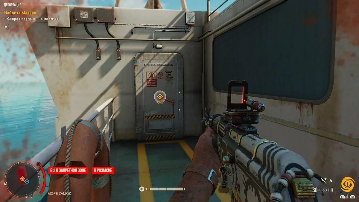 Маккей попытается покинуть остров на корабле. Стреляем по жёлтым контейнерам и топим первое судно. Бизнесмена на нём не окажется, поэтому запрыгиваем на гидроцикл и добираемся до дальнего корабля. Влетаем на полной скорости в пробоину справа в задней части судна и проникаем внутрь. Двигаемся по коридорам к маркеру и уничтожаем всех врагов.