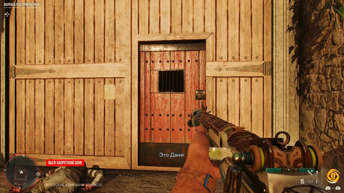 Открываем дверь у стоящего отдельно небольшого здания и возвращаемся к гаражу вместе с узником для завершения миссии.