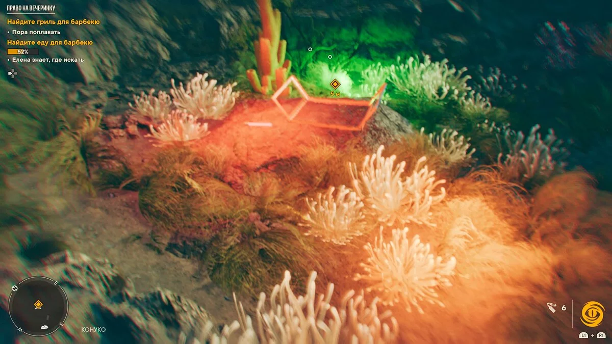 Дожидаемся окончания разговора и прыгаем в океан за мангалом. Просим помощи у Елены и находим морковь и зайцев.