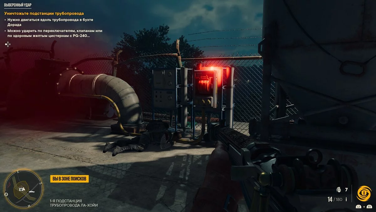 Двигаемся на восток до большой красной зоны вдоль труб. Взрываем жёлтую бочку и двигаемся на северо-восток к 6-й подстанции. Идём дальше в любом направлении вдоль труб, например, к 5-й подстанции. Уничтожаем ещё одну бочку и после телефонных звонков Елены и Фартовой отправляемся на химзавод Маккея к указанной точке.