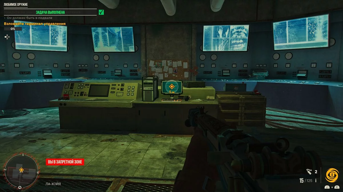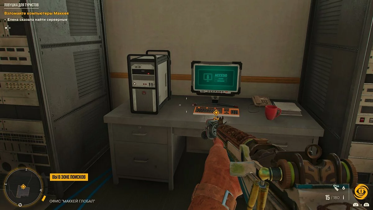 Отправляемся к маркеру и уничтожаем глушилку. Рекомендуется сначала выполнить задание «Вне зоны доступа». После отключения всех 11 устройств следуем к маркеру и взламываем компьютеры Маккея, которые находятся в серверной на первом этаже.