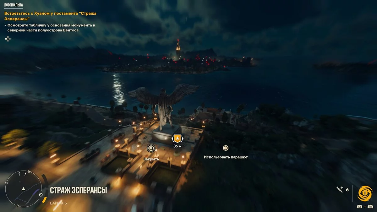 Следуем к маяку, отмеченному на карте. Забираемся наверх при помощи «Кошки», осматриваем корабли через телефон и используем парашют, чтобы добраться до ближайшего судна.