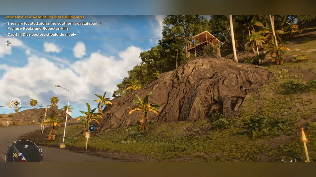 Рекламные щиты не отмечены на карте, а значит искать придется самостоятельно. Всего их пять, хотя для успешного выполнения задания достаточно найти три. Игра даст подсказку: «Они расположены вдоль южной прибрежной дороги вдоль побережья Вациа (Vacia Coast), Пик Обещания (Promise Peaks) и холмов Робустас (Robustas Hills)». Таким образом, искать предстоит на юге региона Эль-Эсте (El Este). Щиты яркого красного цвета и находятся на обочине дороги.