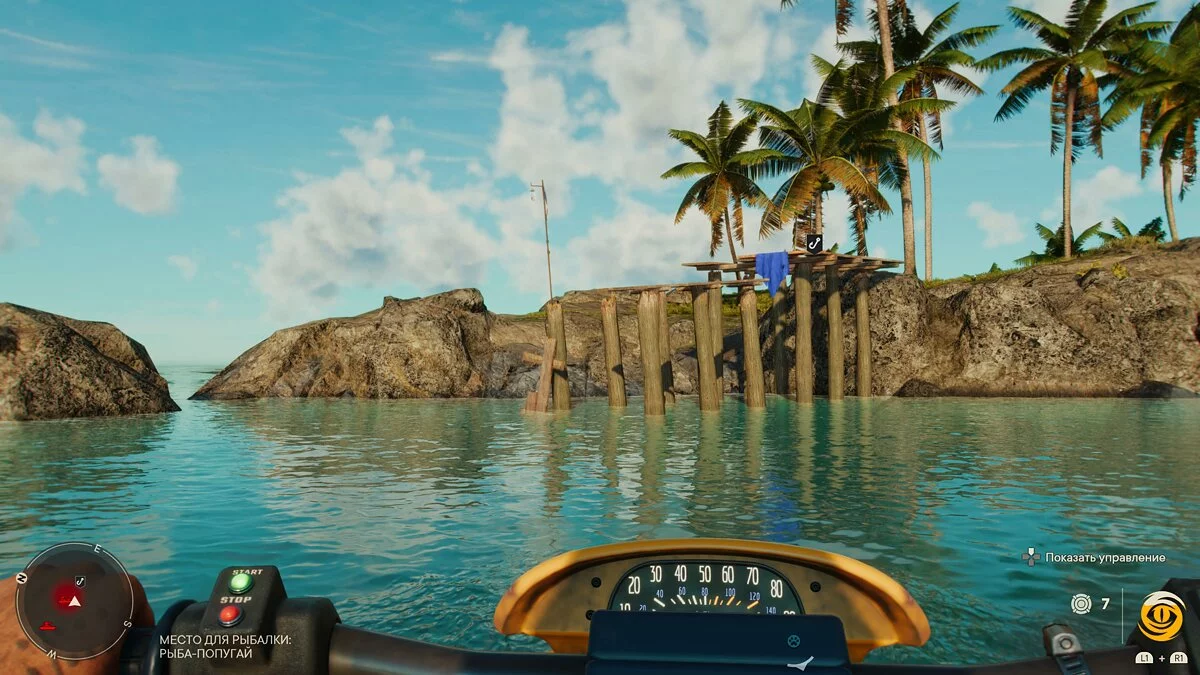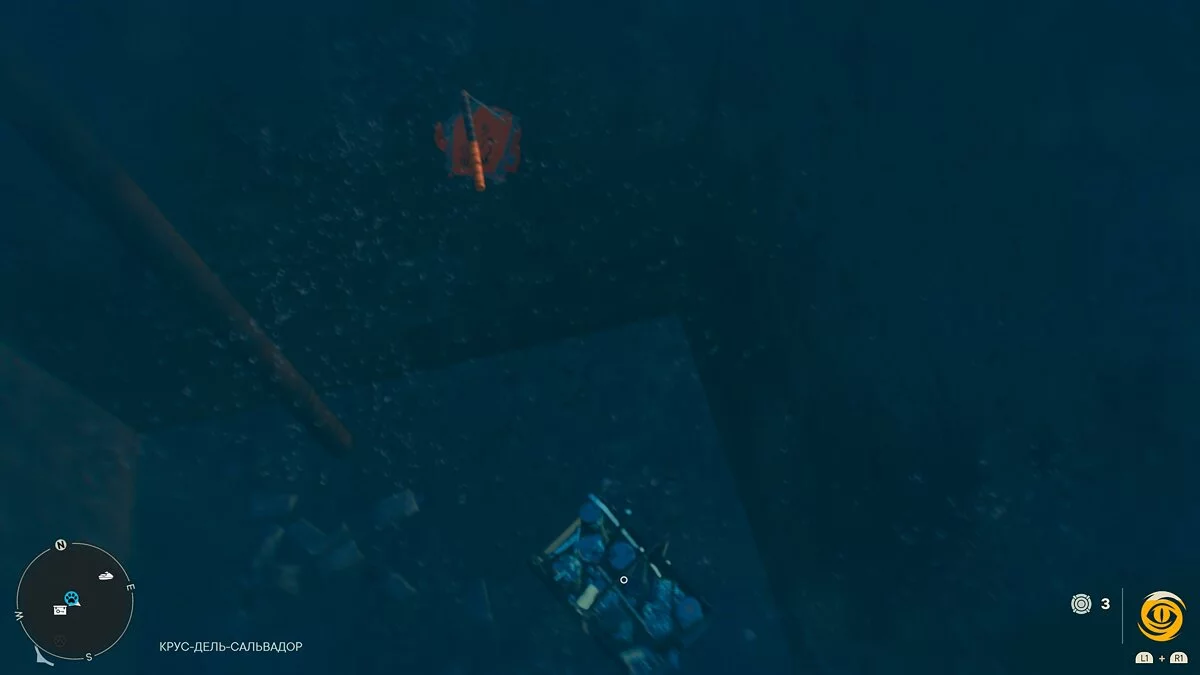 Снова используем водный транспорт и следуем к соседнему острову. Останавливаемся на западной стороне возле колокольчиков и штанги с деревяшкой. Спрыгиваем в воду и опускаемся на дно, чтобы забрать криптограмму «#12 — Акула».