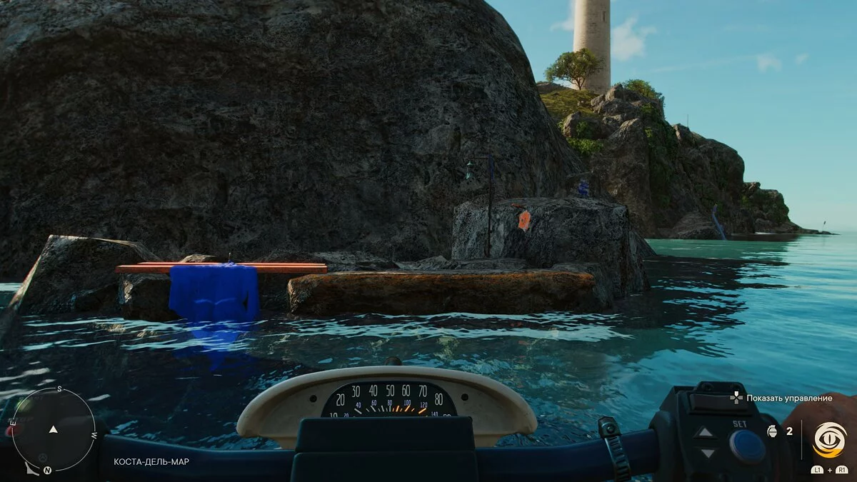 Забираемся обратно в плавательное средство и двигаемся вдоль скал по синим отметкам. Останавливаемся возле шеста с прикреплённой деревяшкой и выходим на берег. Используем «Кошку» и забираем коллекционную криптограмму «#25 — Yara Libre»