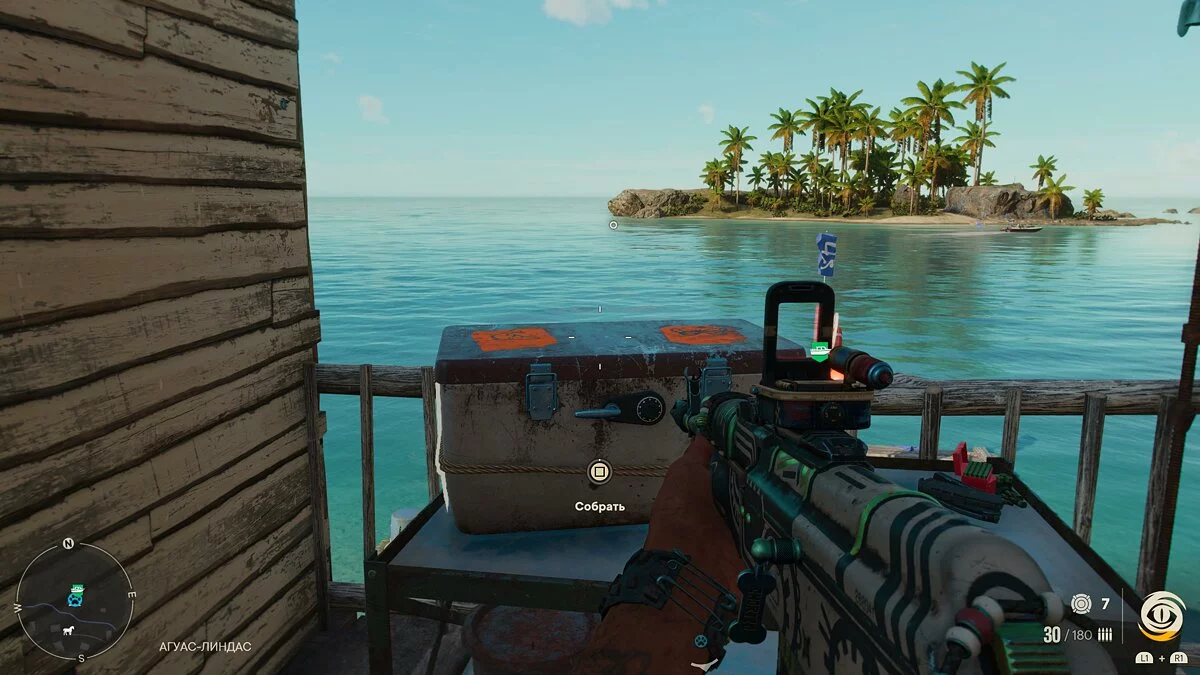 Отправляемся на северную пристань в регионе Агуас-Линдас. Для этого можно десантироваться на КПП в убежище Иды и долететь до точки на костюме-крыле. Сундук находится на террасе крайнего высокого дома. Используйте лестницу, чтобы забраться к хранилищу.