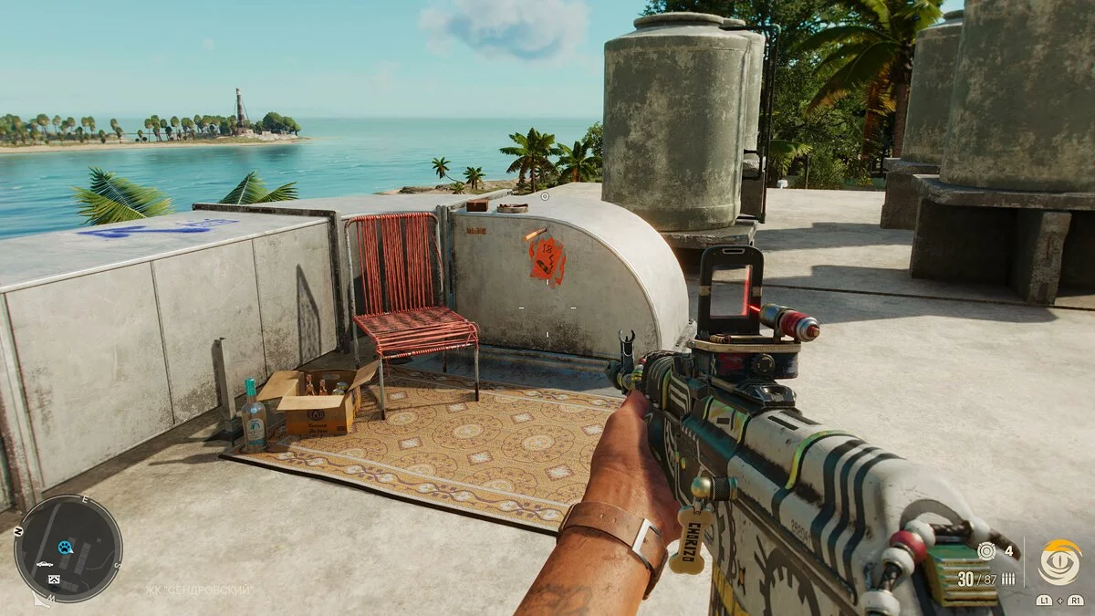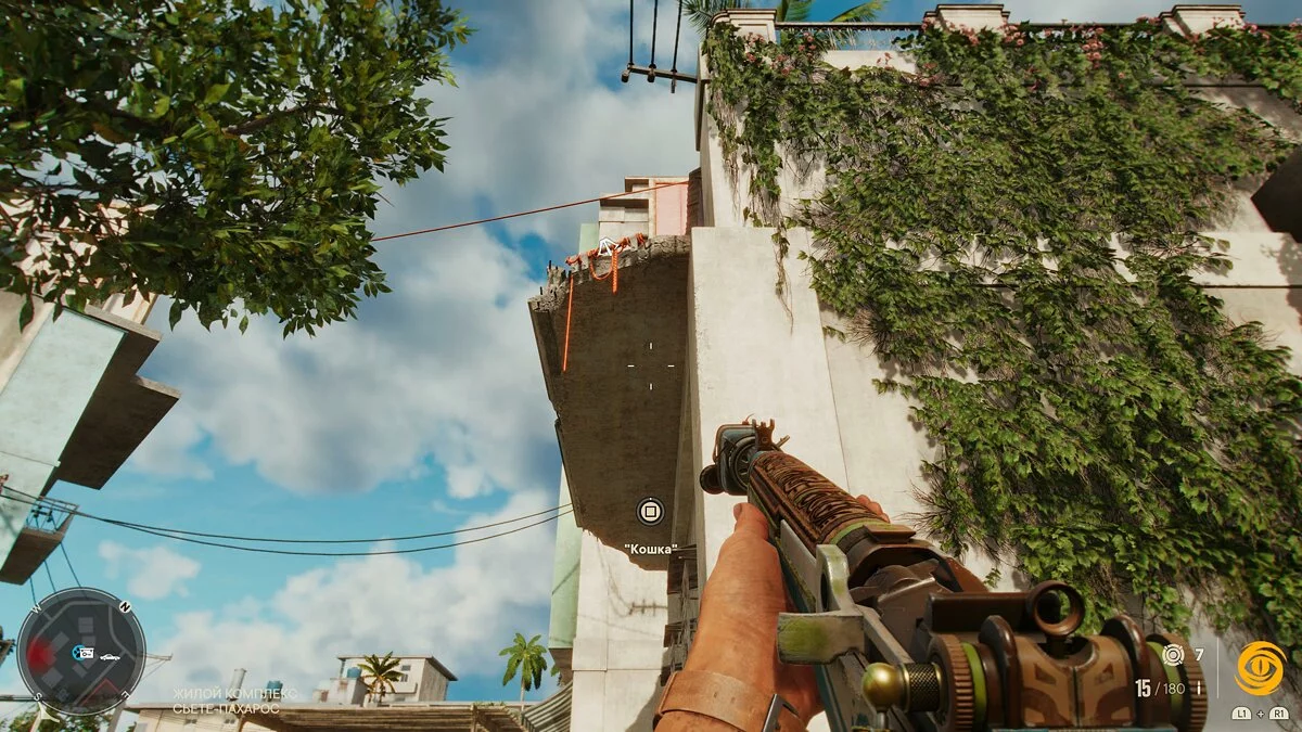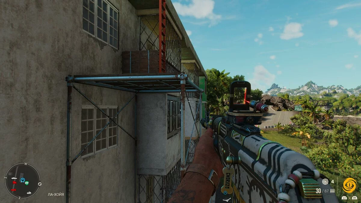 Используем парашют или костюм-крыло и долетаем до здания напротив через дорогу. Подходим к нему со стороны залива Агуха и используем строительные леса, чтобы забраться на крышу. Возле металлических бочек найдём криптограмму «#21 — Кроко-Такси».