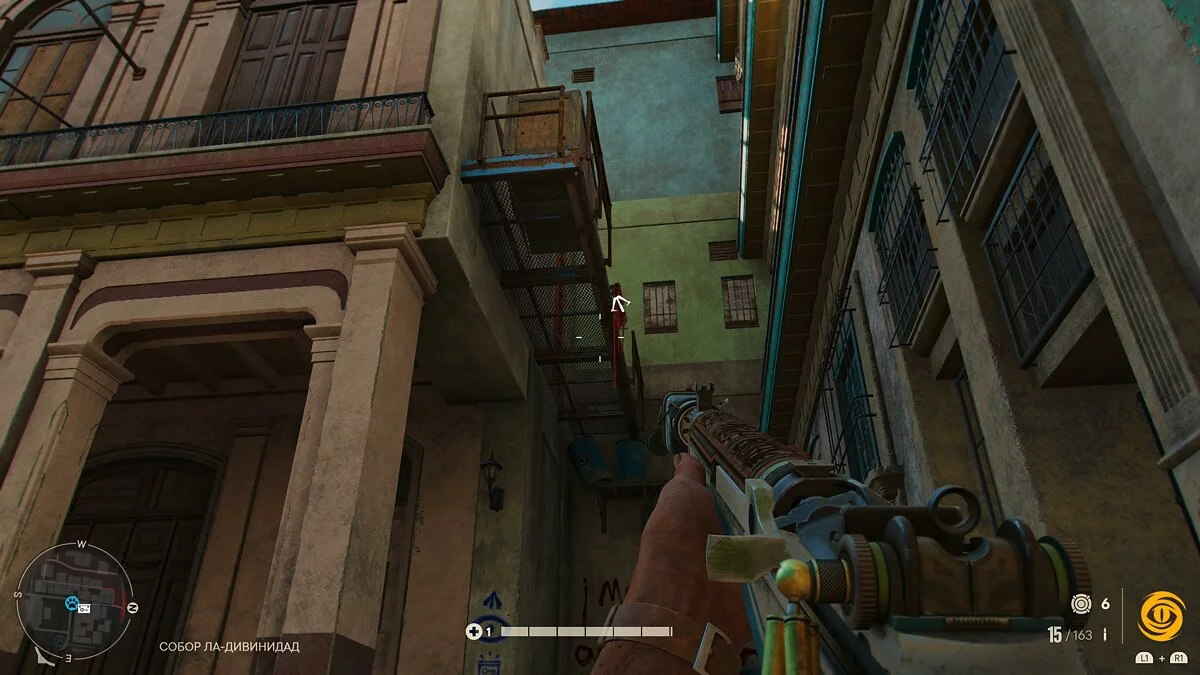Забираемся по красным лестницам на самый верх прилегающего к собору здания. Перепрыгиваем на соседнее строение и цепляемся за лиану. На двери найдём криптограмму «#02 — La Guitarra».