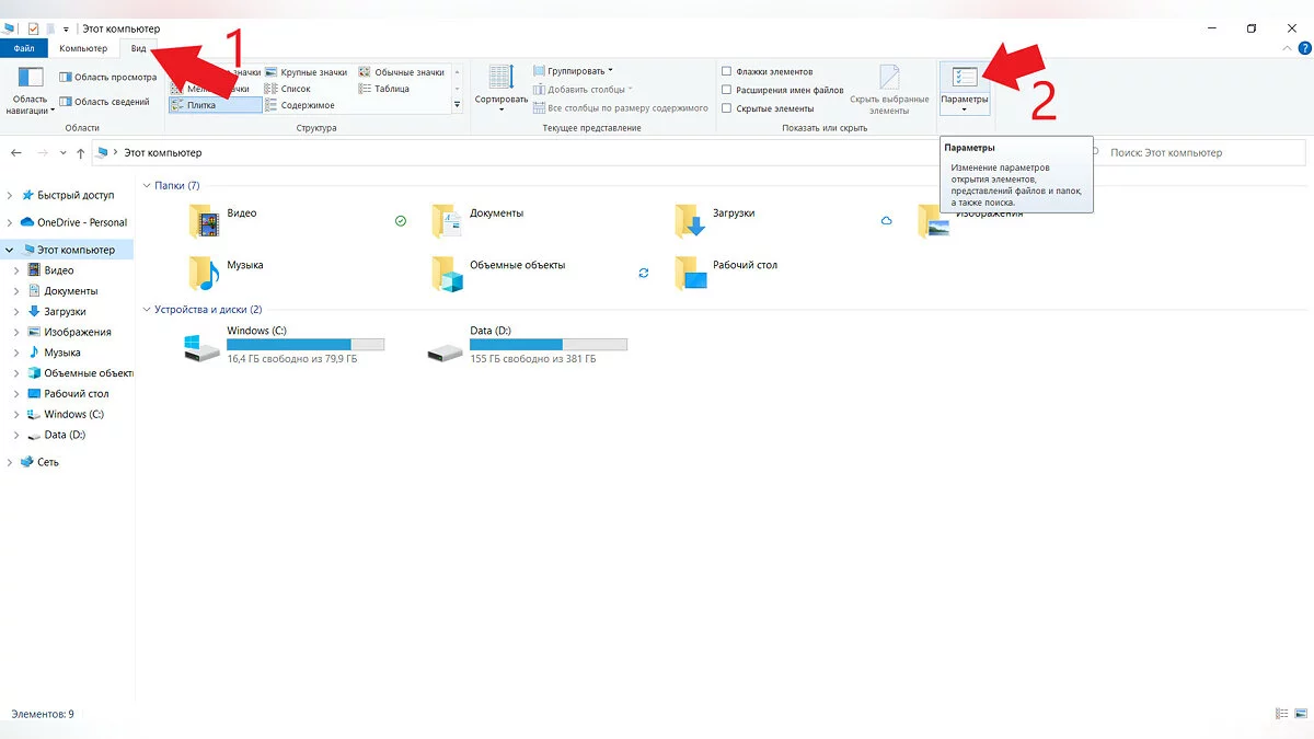 - Выберите «Параметры» (Options) в крайнем правом углу и в открывшемся окне перейдите во вкладку «Вид» (View).