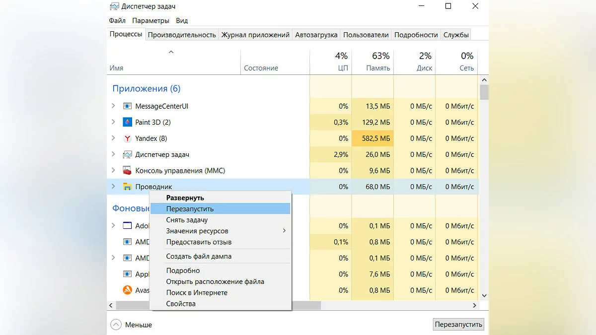 Обратите внимание на размер памяти, которую занимает проводник после его перезапуска. Она должна стать гораздо меньше до устранения проблемы. В качестве временного способа исправления ошибки можно также перезагрузить компьютер.