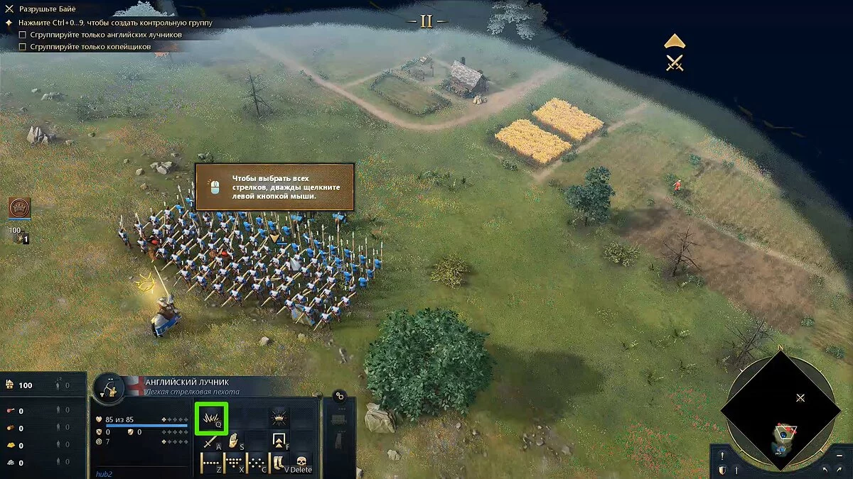 Отразите атаки наездников английскими лучниками, и после к вам присоединятся копейщики. Для защиты от всадников используйте частокол (выберите всех лучников двойным нажатием ЛКМ и нажмите на клавишу Q).