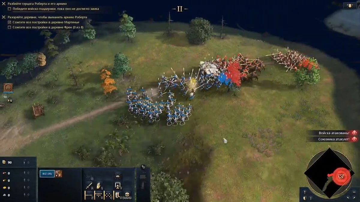 В правом верхнем углу нажмите на единственную иконку и выберите отряды на своё усмотрение. Когда разорите первый посёлок, на востоке карты появится вражеское войско. Вам необходимо перехватить его и уничтожить. Если не успеете, то силы Роберта будут намного превышать ваши.