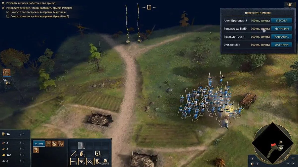 Отправьте свою армию на восток и разорите несколько деревень рядом с замком герцога Роберта. Для этого убейте всех жителей и уничтожьте все дома в поселениях. В разрушенных деревнях соберите золото, чтобы попросить помощи у других правителей. В первой деревне вы найдёте 700 золотых, а во второй — 400.