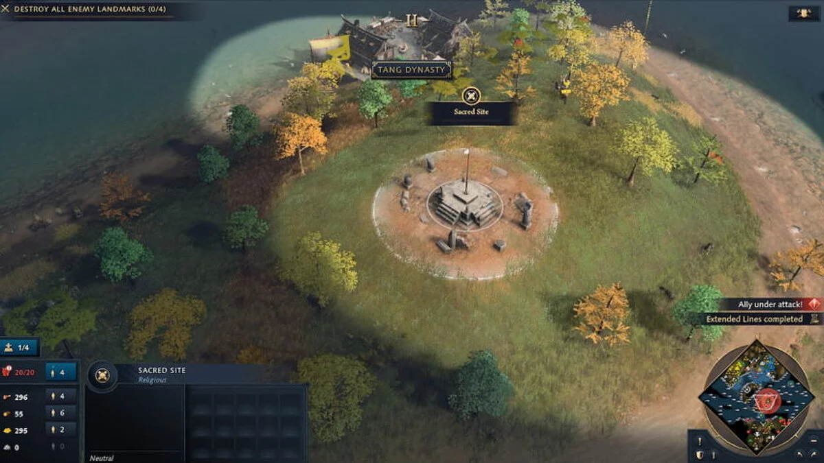 - Сосредоточьтесь на захвате и удержании двух священных мест как можно раньше и не потеряйте их. Если противник захватит одно — немедленно отбейте назад. Если враг продолжит удерживать позицию, он создаст множество защитных сооружений, что серьезно затруднит повторный захват. Быстро создавать воинов и достигнуть третьей эпохи жизненно важно для победы;