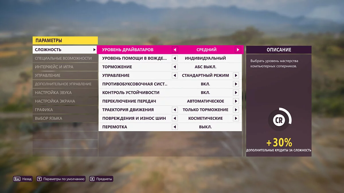 - Контроль устойчивости. Эту опцию всегда оставляйте выключенной. Контроль устойчивости заметно замедляет автомобиль и затрудняет выдерживание заносов на гонках по бездорожью.
