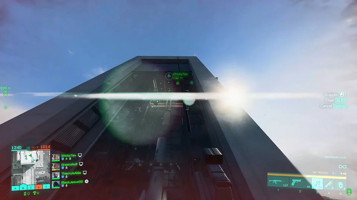 В большинстве случаев крюк может спасти вам жизнь. Это особенно актуально, если вы находитесь на крыше здания, которое пытаются занять вражеские бойцы. Чтобы безопасно покинуть здание и не разбиться, прыгайте с крыши и зацепитесь крюком за стену. Подождите, пока ваш боец опустится на безопасное расстояние от земли и нажмите на клавишу прыжка.