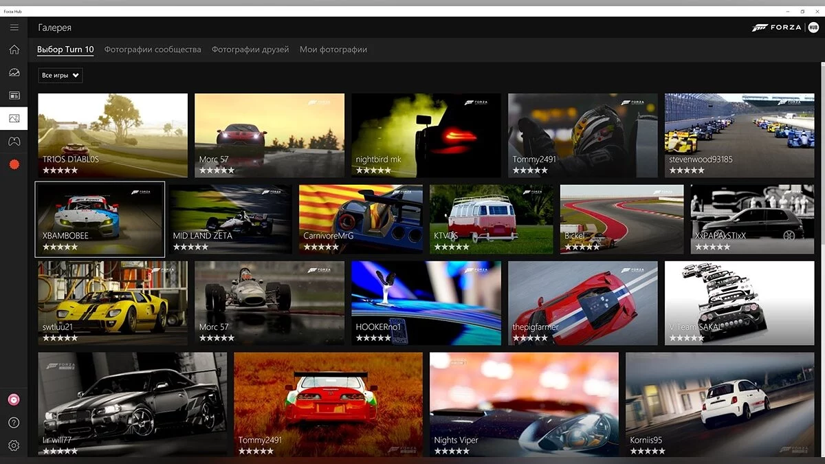 Проблему можно решить, скачав официальное приложение Forza Hub. Открыв его, вы увидите слева столбец разделов: главная, моя Forza, новости и события, галерея, игры. В галерее можно посмотреть рейтинг лучших фотографий, а также снимки сообщества, друзей и ваши. Приложение полностью русифицировано, поэтому проблем с поиском возникнуть не должно.