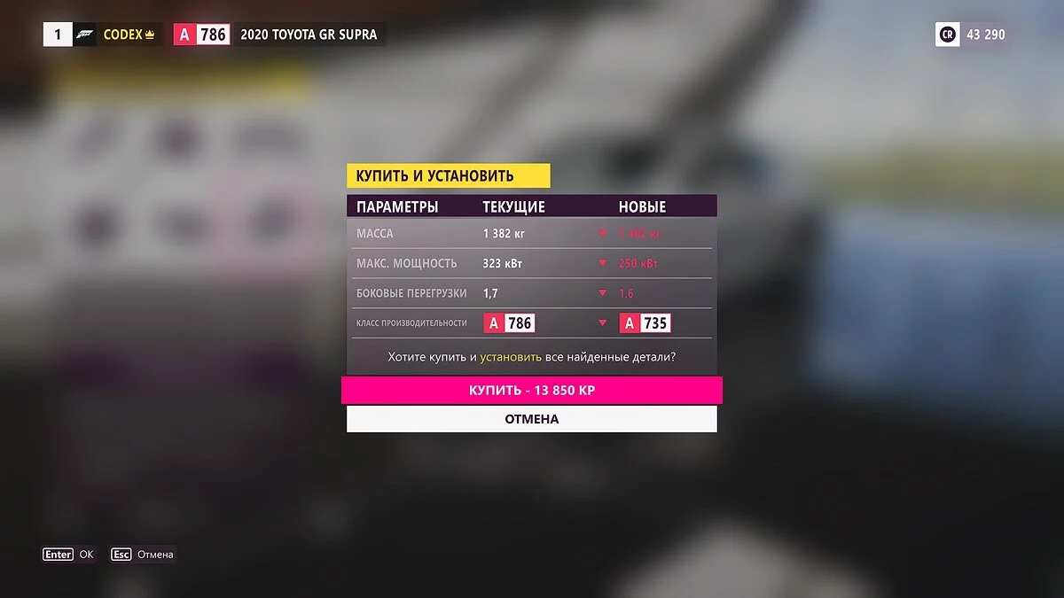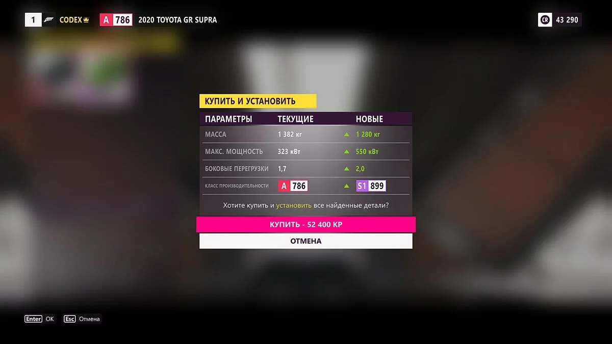 Перед тем, как покинуть меню пользовательской модернизации и установить все приобретённые детали на авто, вы увидите диалоговое окно, в котором можете сравнить транспорт до и после тюнинга. Если вас устраивают новые характеристики автомобиля, нажмите «Купить».