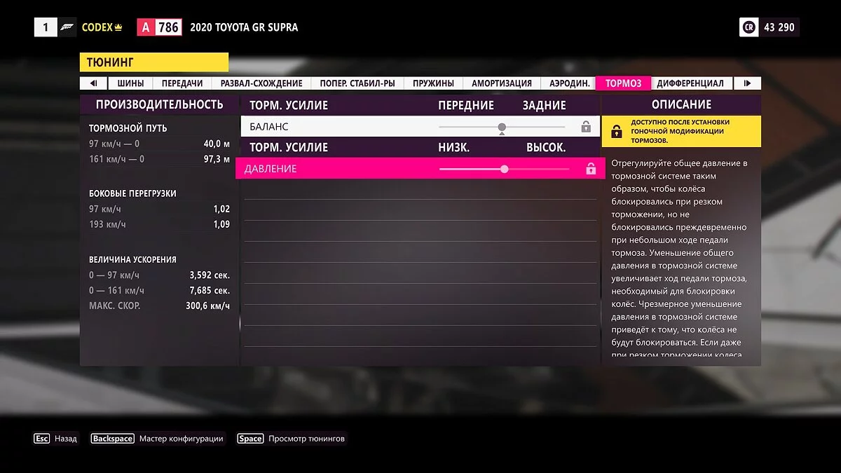 В этом разделе вы можете настроить баланс тормоза между передними и задними колесами, а также отрегулировать тормозное усилие. Чтобы обеспечить более плавное торможение, следует сместить баланс тормоза к задним колёсам. Если в гонке вам необходимо быстро остановить свой транспорт, следует сместить баланс тормоза к передним колёсам.