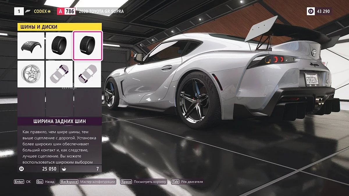 В этом разделе вы можете настроить состав, ширину шин, а также расстояние шин между передними и задними колесами. Такая настройка позволит увеличить или снизить основные показатели: управляемость, ускорение и разгон.