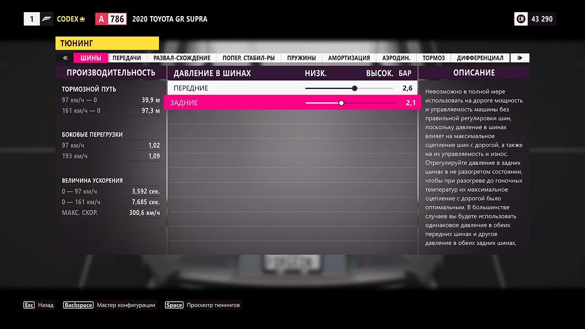 В этом окне вы можете отследить производительность шин (эффективный тормозной путь, боковые перегрузки и величину ускорения), а также настроить давление в шинах.