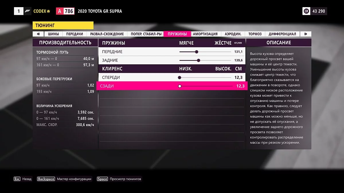 Одним из самых важных параметров для дрифта является дорожный просвет. Его можно регулировать во вкладке «Пружины» — «Клиренс». Чем меньше дорожный просвет у вашего авто, тем лучше сцепление с дорогой во время заносов. Здесь важно не перестараться, ведь, как мы писали выше, слишком низкий дорожный просвет может привести к «опусканию» автомобиля в поворотах на большой скорости. Это приведёт к полной потере управления. Начните со значения 12,3 на передней и задней оси и повышайте его по мере необходимости.