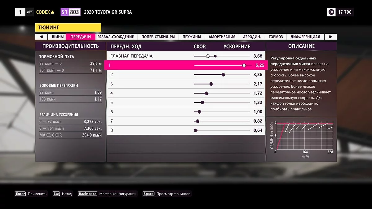 В меню передач вы можете настроить передаточное число, а также настройку главной передачи. Передаточные числа относятся к расстоянию между шестернями. Более высокое передаточное число повышает ускорение, но снижает максимальную скорость.