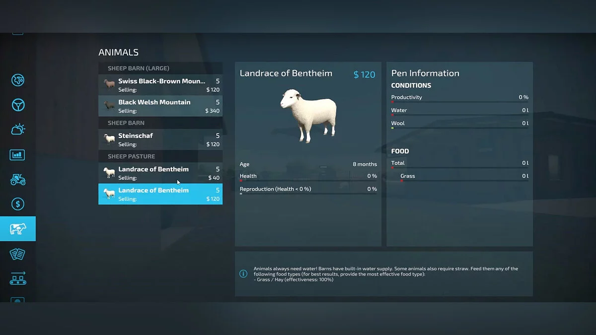 Важно отметить — некоторые характеристики зависят от места жительства. Например, в сараях есть постоянная подача воды, но в обычных загонах этот параметр всегда будет активным для всех животных, находящихся под открытым небом. В свою очередь, в сараях нужна солома для сна, а на открытых местах нет. Это полезно помнить, так как вы сможете самостоятельно менять количество задач, переселяя животных из сараев в загоны и обратно. В дальнейшем можно также купить робота для автоматического кормления, что еще больше упростит уход за скотом.
