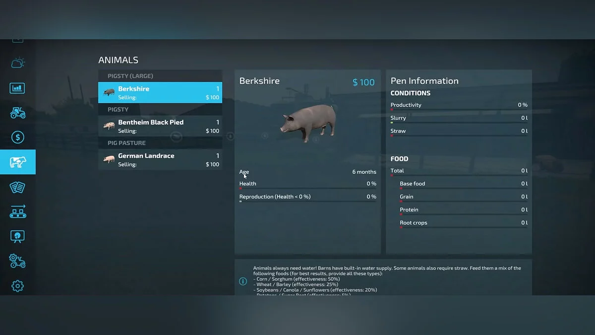 - Еда — рацион свиней шире, чем у предыдущих видов животных. Их базовой пищей является кукуруза или сорго — 50% эффективности. Дополнительно можно использовать пшеницу или ячмень — 25% эффективности, соевые бобы, рапс, подсолнечник — 20% эффективности, картофель, сахарная свекла — 5% эффективности. Вам необязательно всегда кормить животных со 100% эффективностью, поэтому 5% можно жертвовать для экономии средств.