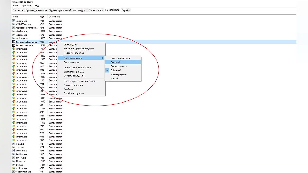 - Установите у лаунчера «Высокий» приоритет в диспетчере задач. Для этого нажмите сочетание клавиш Ctrl+Alt+Del, выберите «Диспетчер задач», откройте вкладку «Подробности», найдите Bethesda Launcher, нажмите по нему правой кнопкой мыши и откройте меню «Задать приоритет». В новом окне выберите пункт «Высокий».