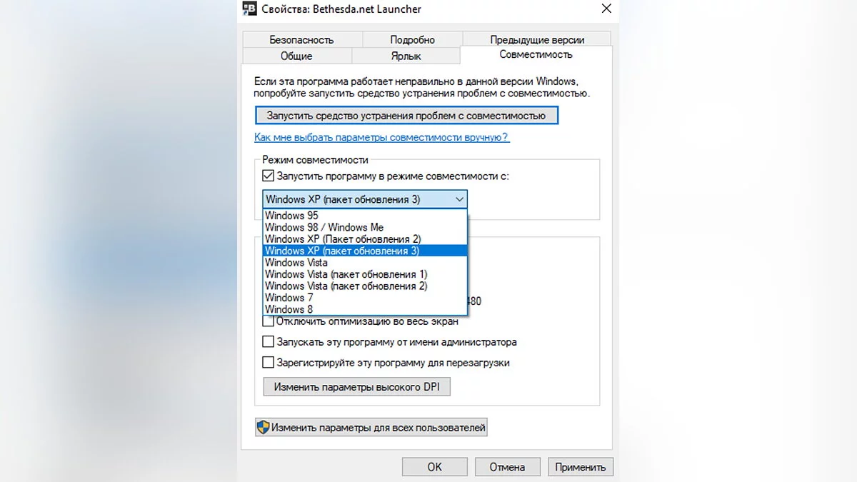 - Установите совместимость с Windows Vista SP2. Для этого щёлкните правой кнопкой по файлу bethesdanetupdater.exe, выберите пункт «Свойства», затем — «Совместимость» и поставьте галочку рядом со строчкой «Запустить программу в режиме совместимости с:». В списке ниже выберите вариант «Windows Vista (пакет обновления 2)».