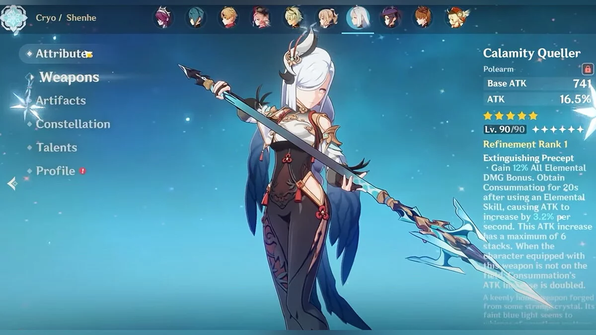 - Шэнь Хэ. Эта пятизвёздочная копейщица была добавлена в игру вместе с обновлением 2.4. Ей мы посвятили отдельный гайд. Она относится к персонажам поддержки, который увеличивает урон другим героям, а её взрыв стихий продолжает атаковать и ослаблять врагов, даже когда вы переключаетесь на другого бойца. К тому же, эффективность элементального навыка Шэнь Хэ зависит от её силы атаки. Как результат, «Усмиритель бед» — идеальный выбор для неё.