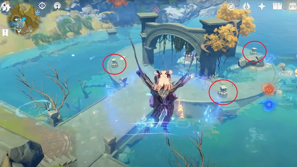 Вам нужно разбивать жёлтые камни, расположенные поблизости. Из них будут выскакивать огоньки, которые полетят за вами. Как можно быстрее плывите к ближайшему алтарю. Вам нужно успеть, пока огонёк не исчез. Если не успели — возвращайтесь к камню, ломайте его и пробуйте снова. Один из них расположен прямо на постаменте с алтарями: