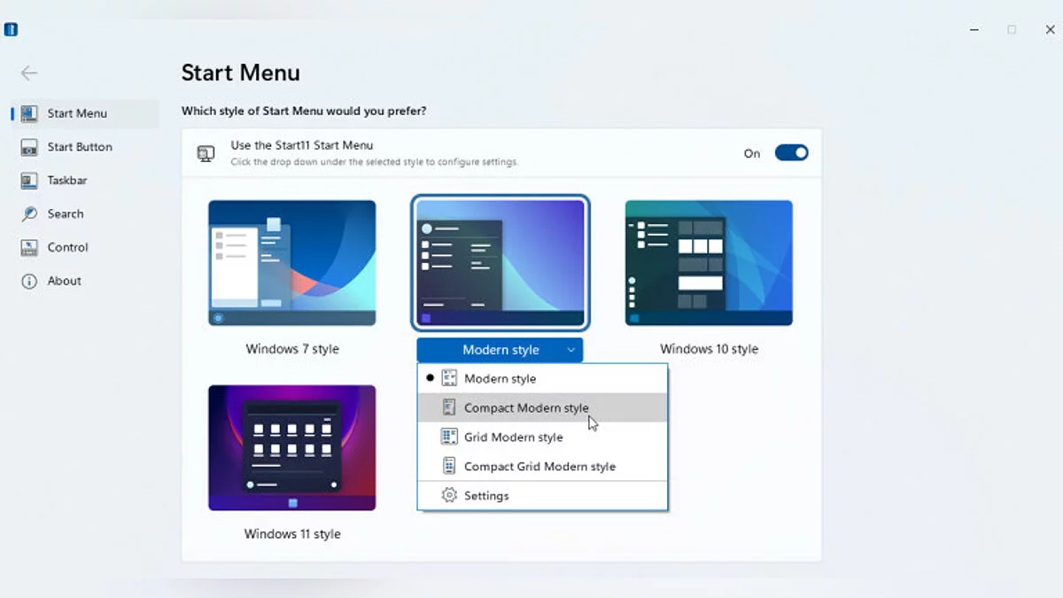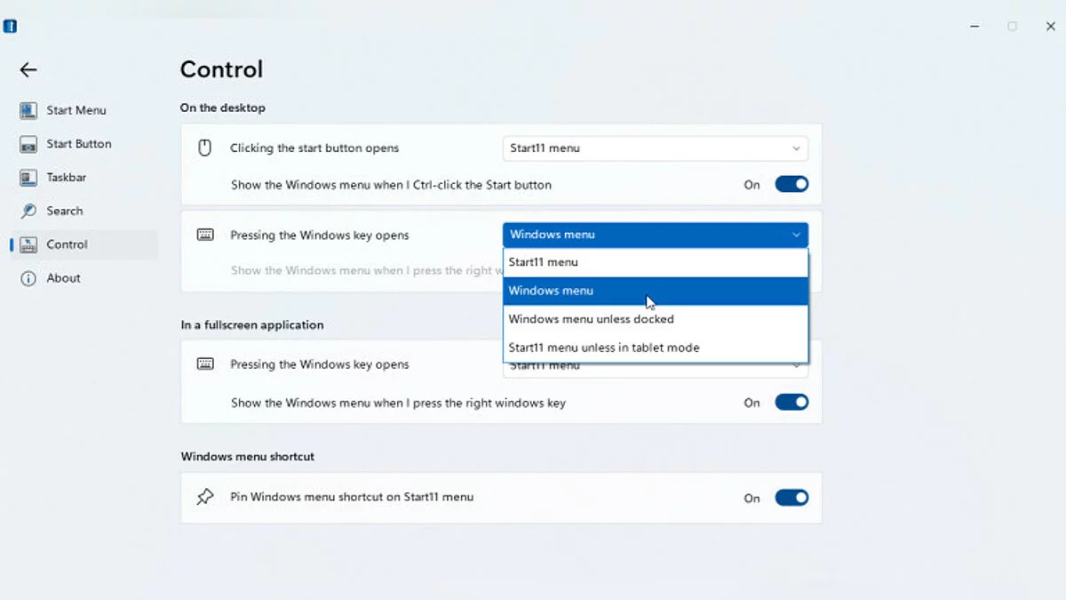 С помощью настроек можно выровнять кнопку по центру или по левому краю, выбрать стиль меню, в числе которых есть вариант а-ля Windows 7, современный дизайн, стиль Windows 10 или Windows 11. Помимо этого, каждый вариант можно гибко настроить. К примеру, на вкладке «Управление» можно настроить программу так, чтобы нажатие кнопки «Пуск» на экране вызывало меню Start 11, а нажатие кнопки Windows на клавиатуре активировало обычный «Пуск» из Windows 11.