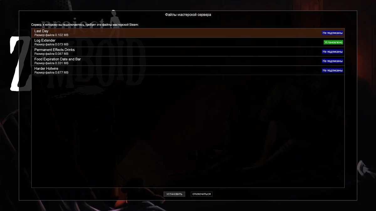 - После открытия окна «Файлы мастерской сервера» нажмите кнопку «Установить», чтобы загрузить недостающие модификации.