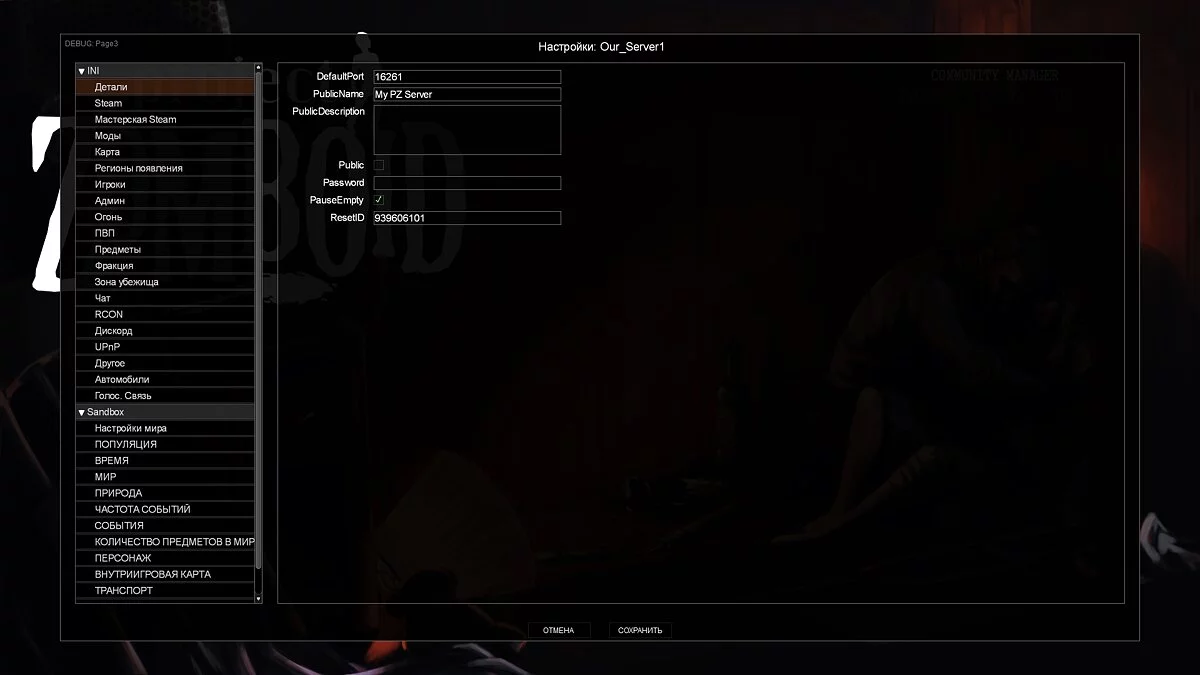 - В следующем окне сразу же откроется раздел «Детали», где пользователь может настроить первоначальные параметры сервера. Не рекомендуется менять значение «DefaultPort». В разделе «PublicName» игрок может ввести имя сервера. Также проверьте, чтобы в пункте «Public» маркер был неактивным (отсутствовала зелёная галочка), иначе сервер может отобразиться в общем списке и к игре начнут подключаться другие пользователи.