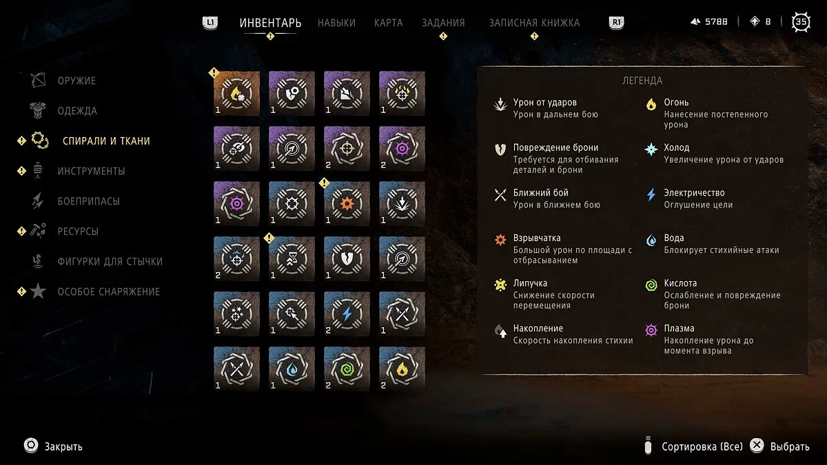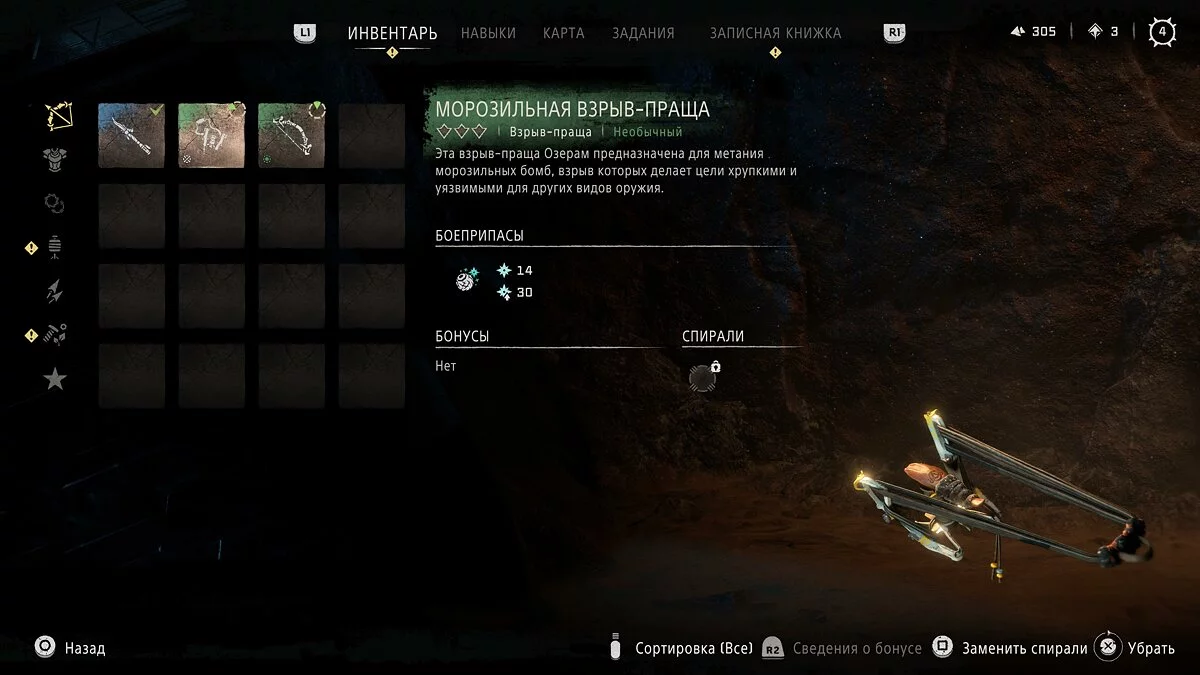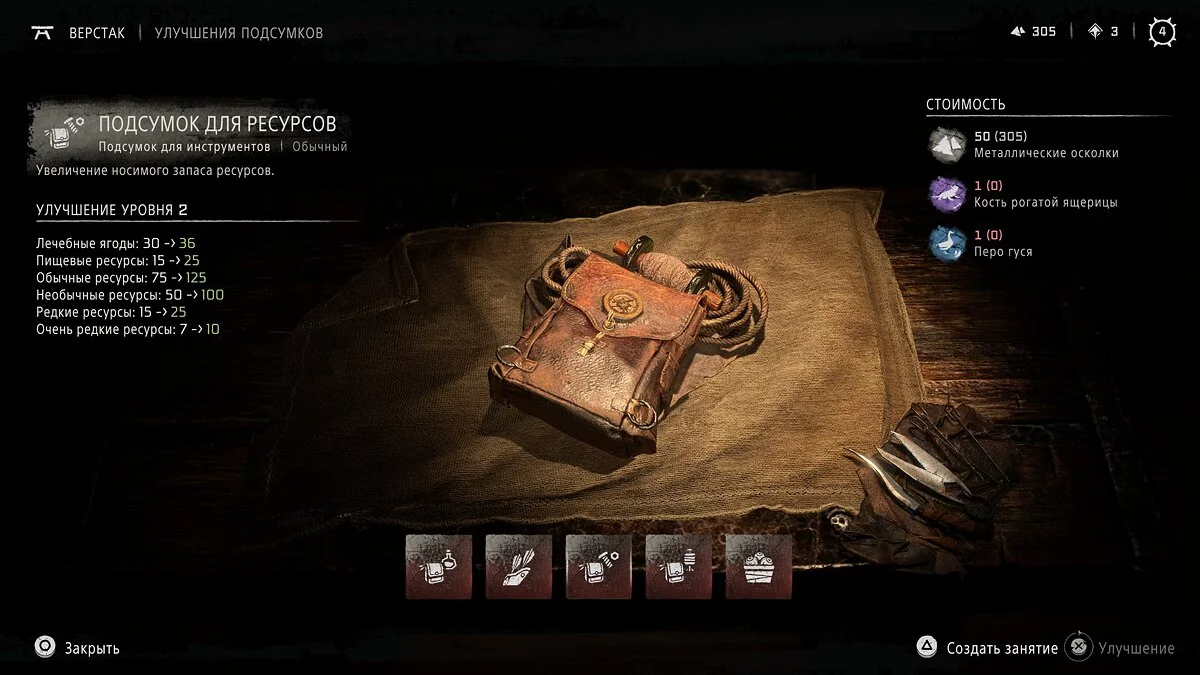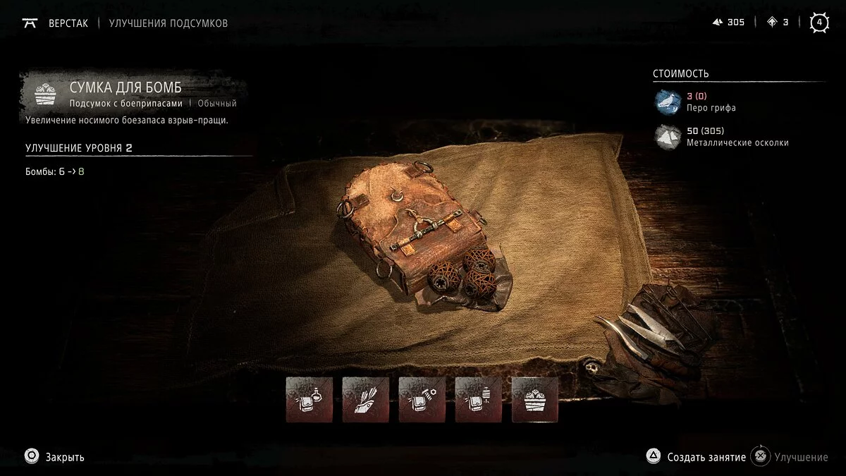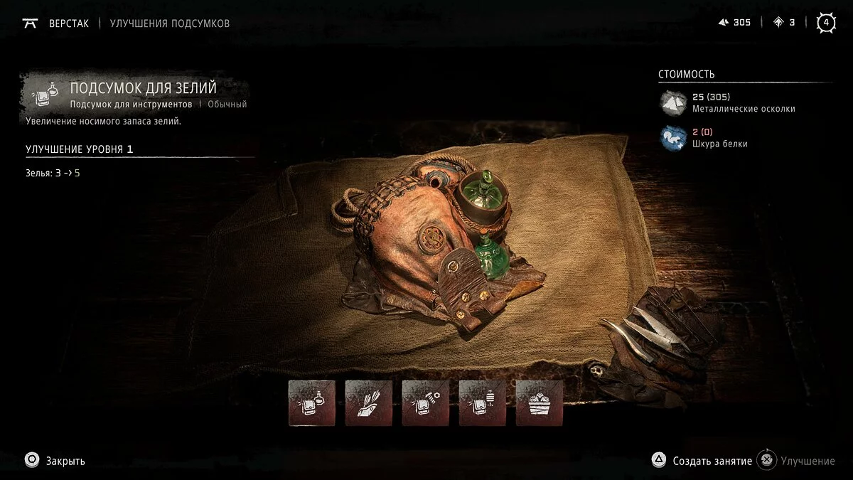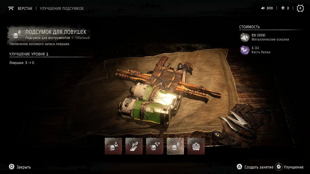 Подходим к столу и нажимаем кнопку «Треугольник» для перехода в меню улучшений. Теперь необходимо выбрать соответствующий раздел прокачки. В этом меню игрок может улучшить оружие, одежду и подсумки, а также изготовить ловушки, зелья и особое снаряжение, которое откроется по сюжетной линии.