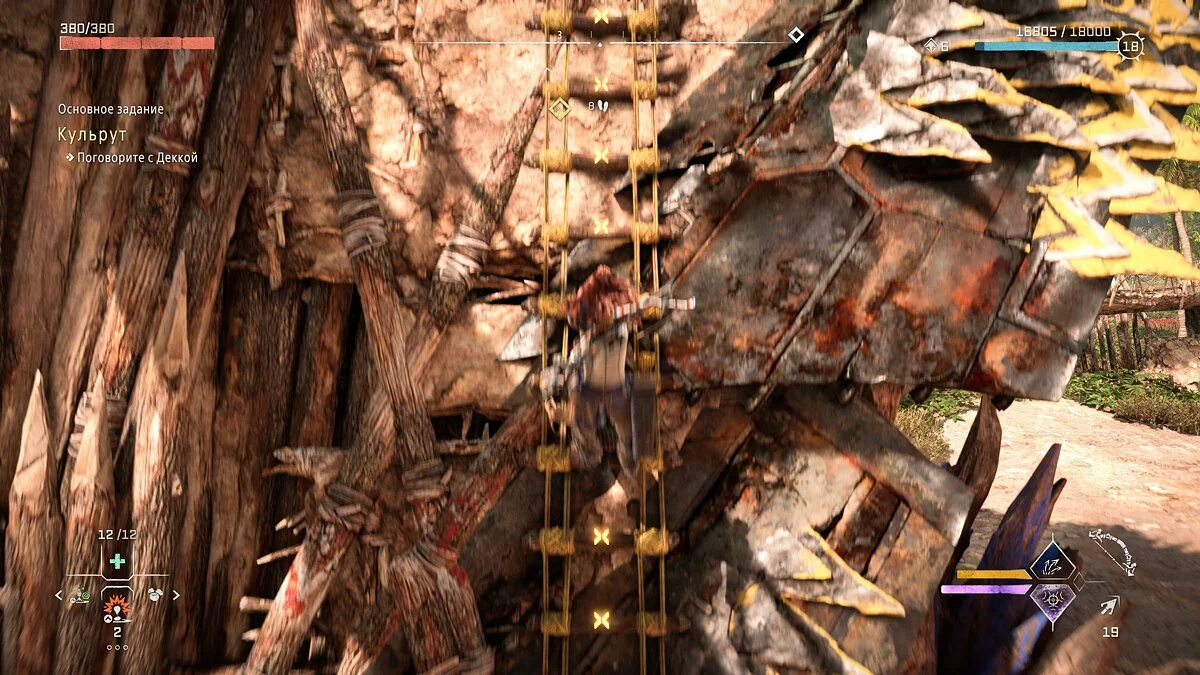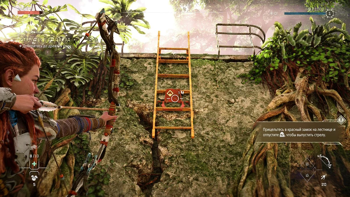 Лезьте наверх. Балка обрушится, поэтому развернитесь и заберитесь с другой стороны. Посмотрите кат-сцену, после которой Варл даст Элой пращу.