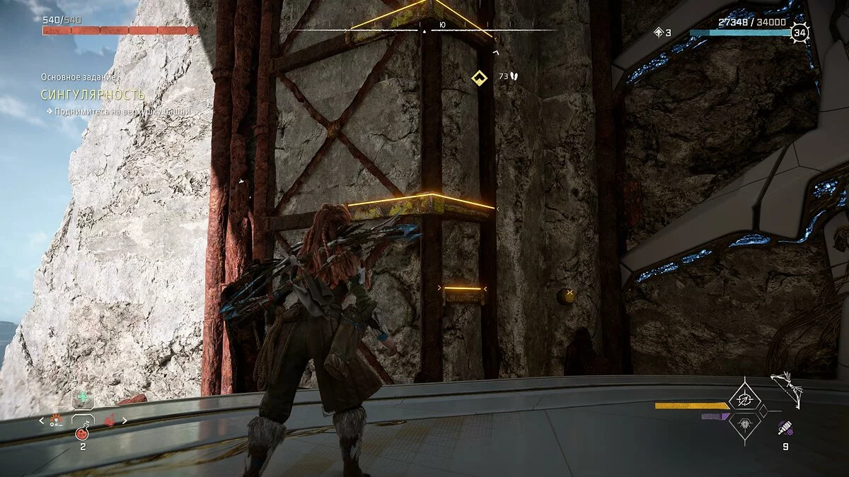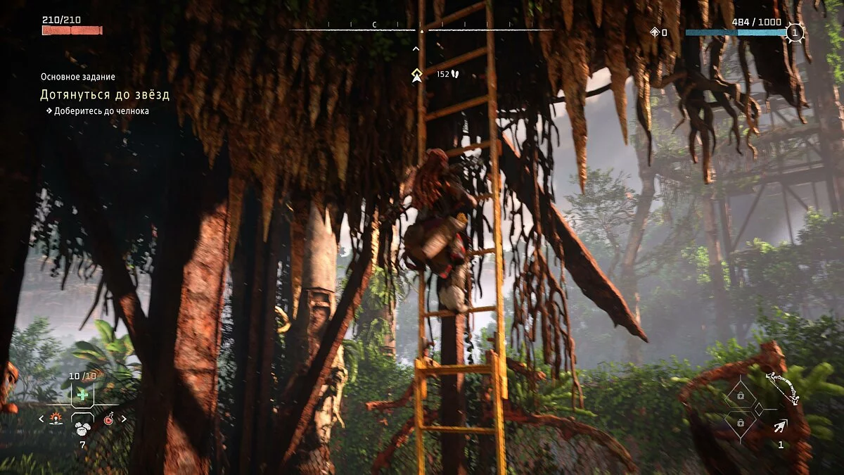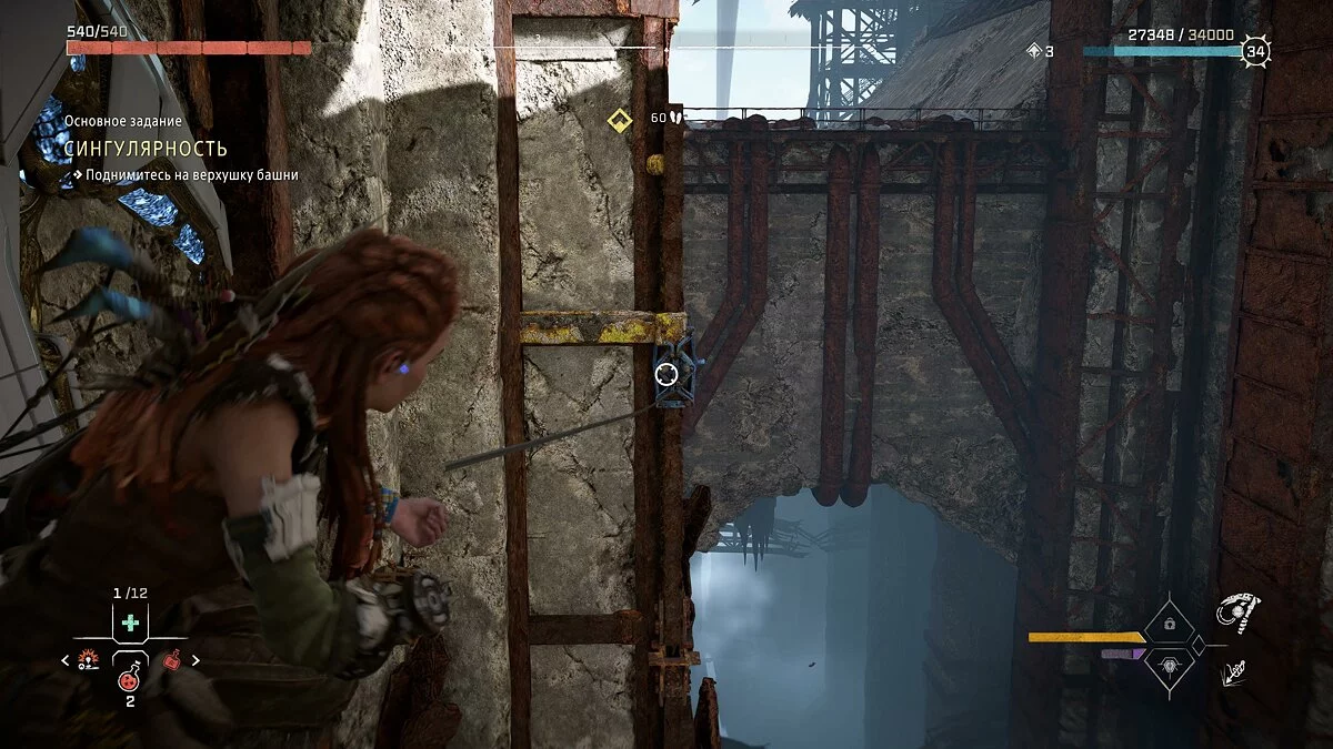 Затем подойдите к стене и выдерните решетку. Там же вы увидите балки, на которые можно залезть. Сделать это сложнее, чем кажется — Элой не будет цепляться. Обратите внимание на холм, только с него девушка сможет забраться.