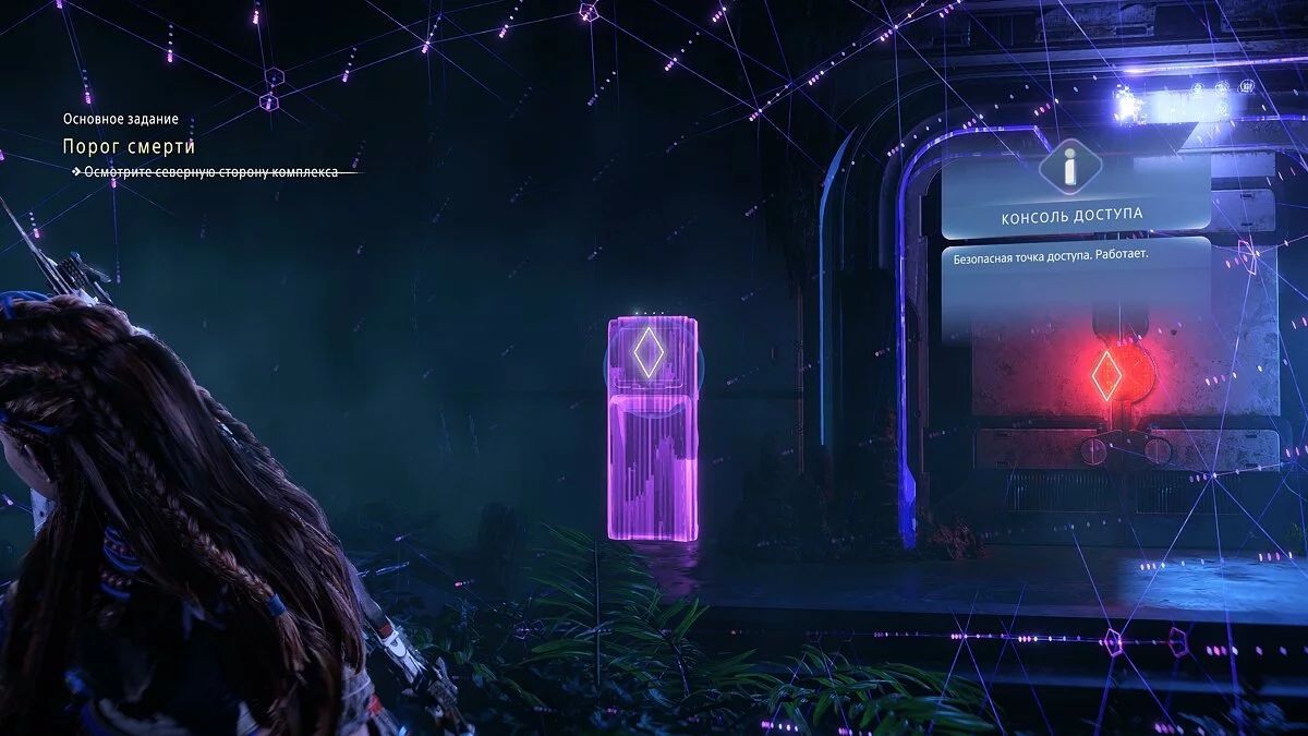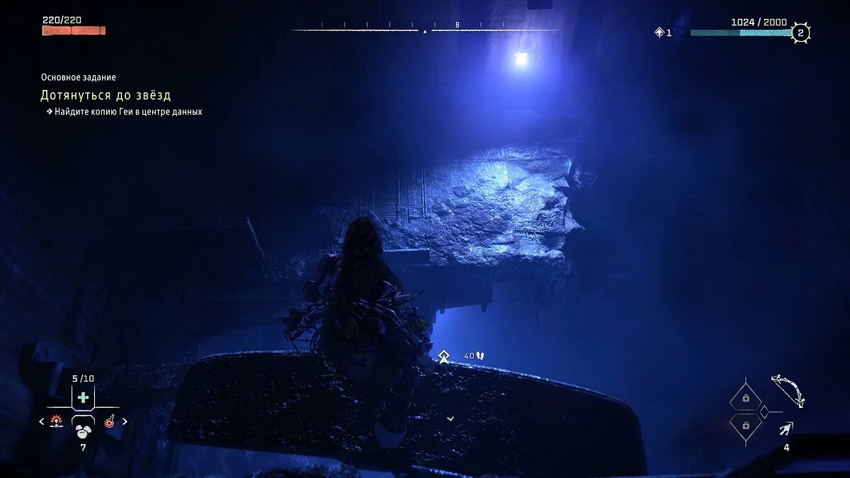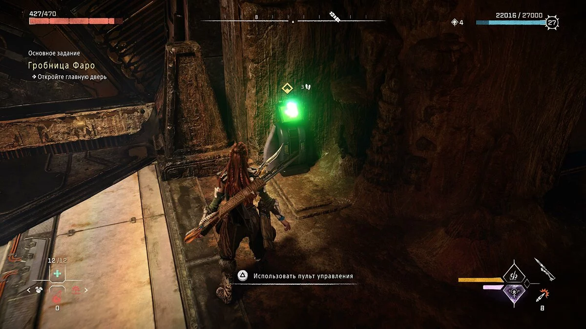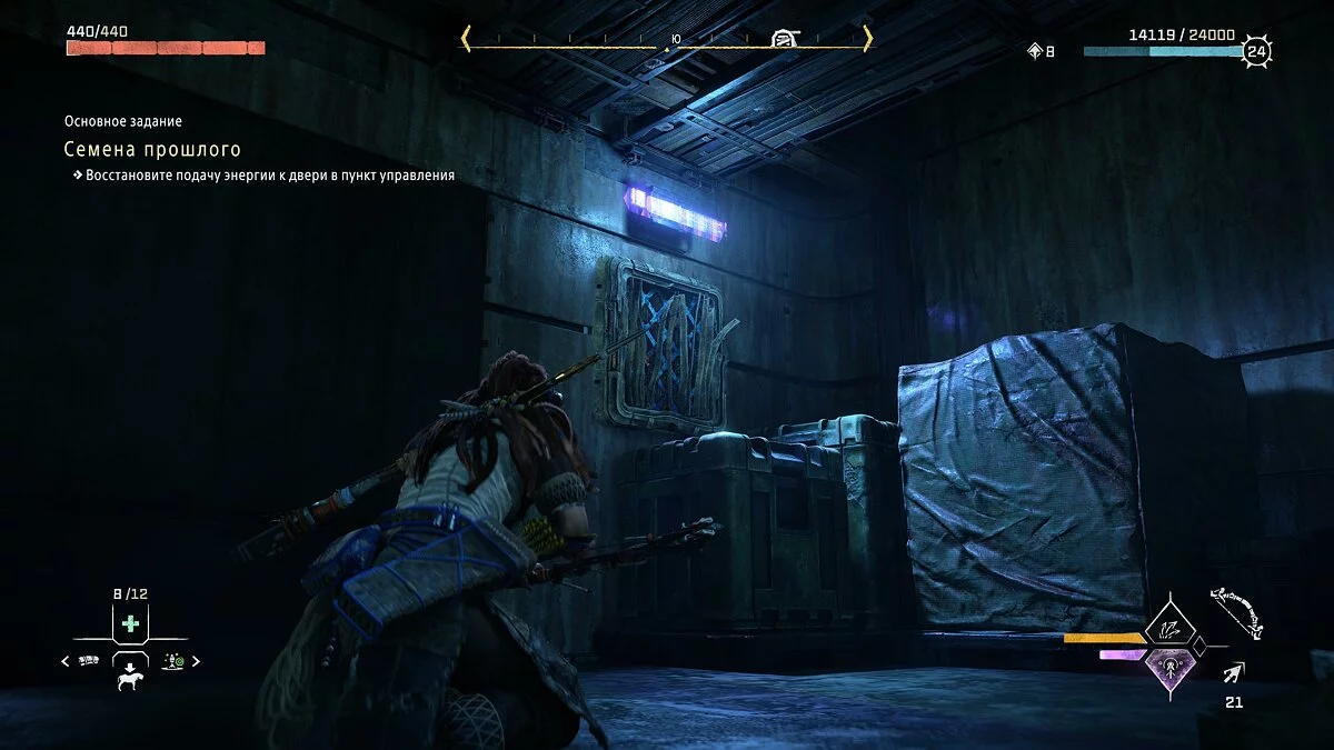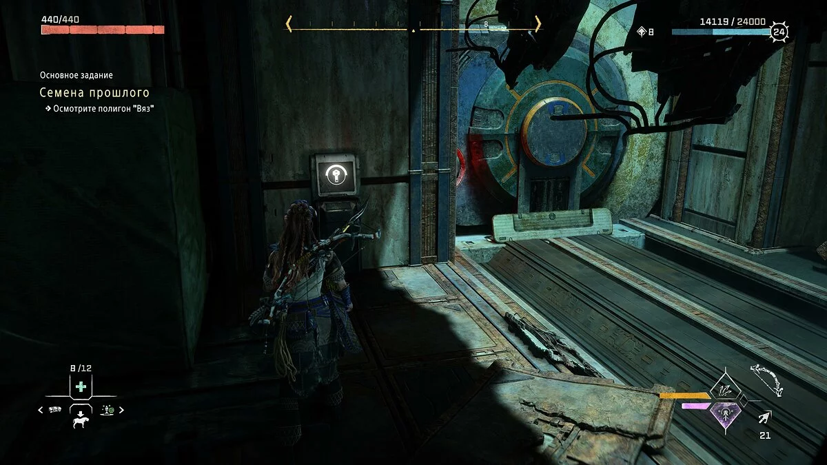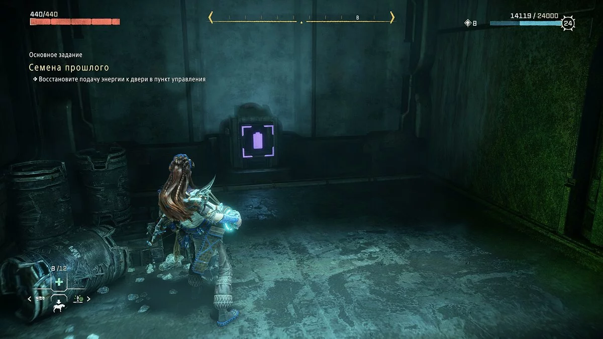 Вам нужно налево, преодолейте все препятствия используя крюк. Около закрытой двери прыгните, чтобы попасть в комнату через верхнее отверстие. Элой заметит, что в помещении нет питания. Зайдите за угол, чтобы найти батарею и открыть проход.