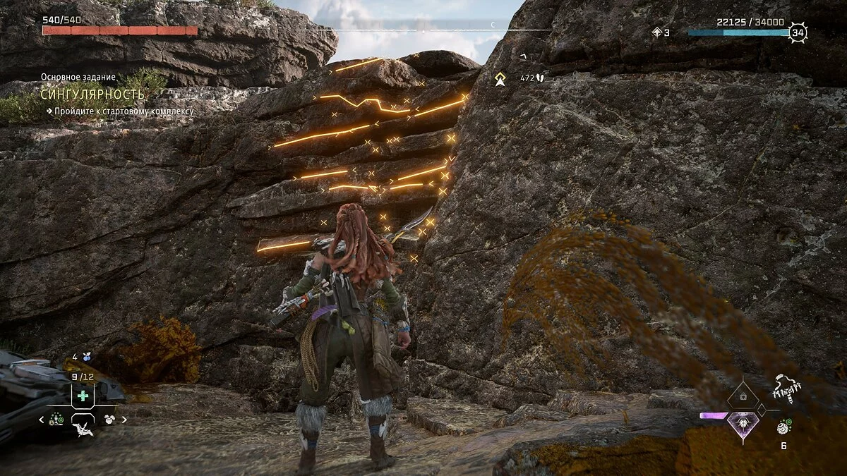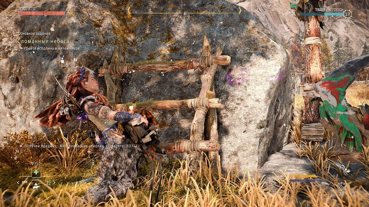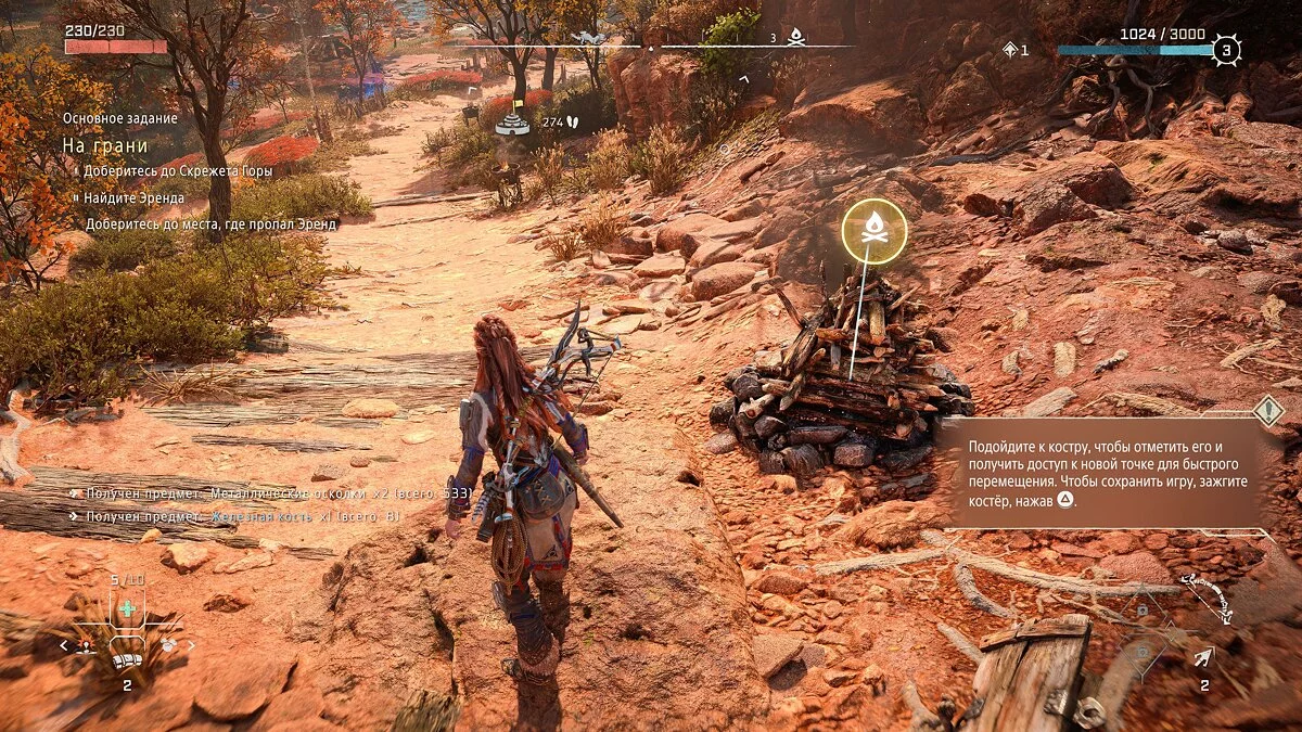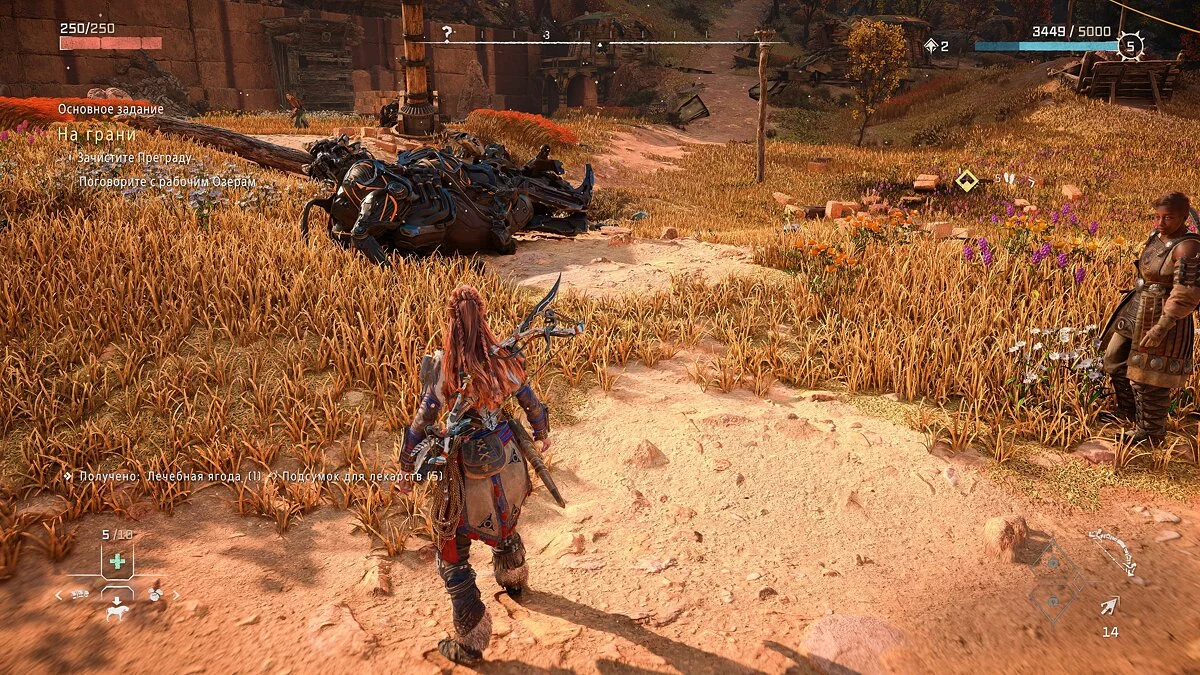 Элой нужно найти Эренда и расчистить путь от агрессивных машин. Стражник советует сделать кислотные стрелы, поэтому сначала направляйтесь в Скрежет Горы и улучшить лук. Не забудьте осмотреть территорию и собрать ресурсы около подъемника.