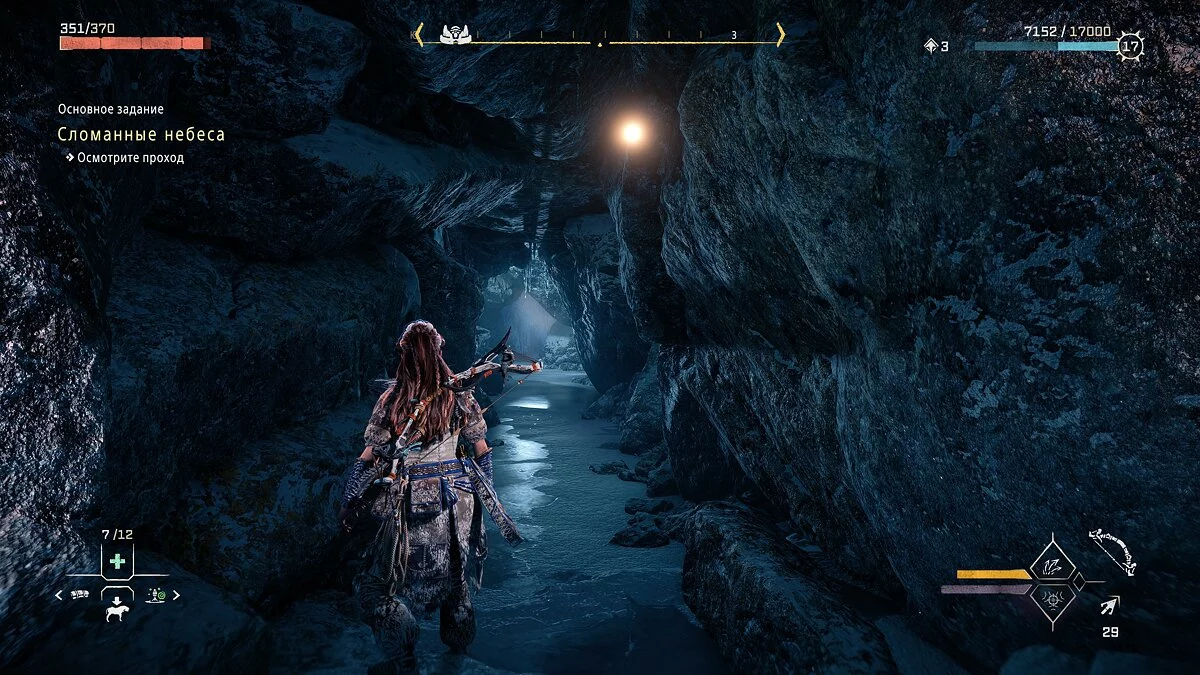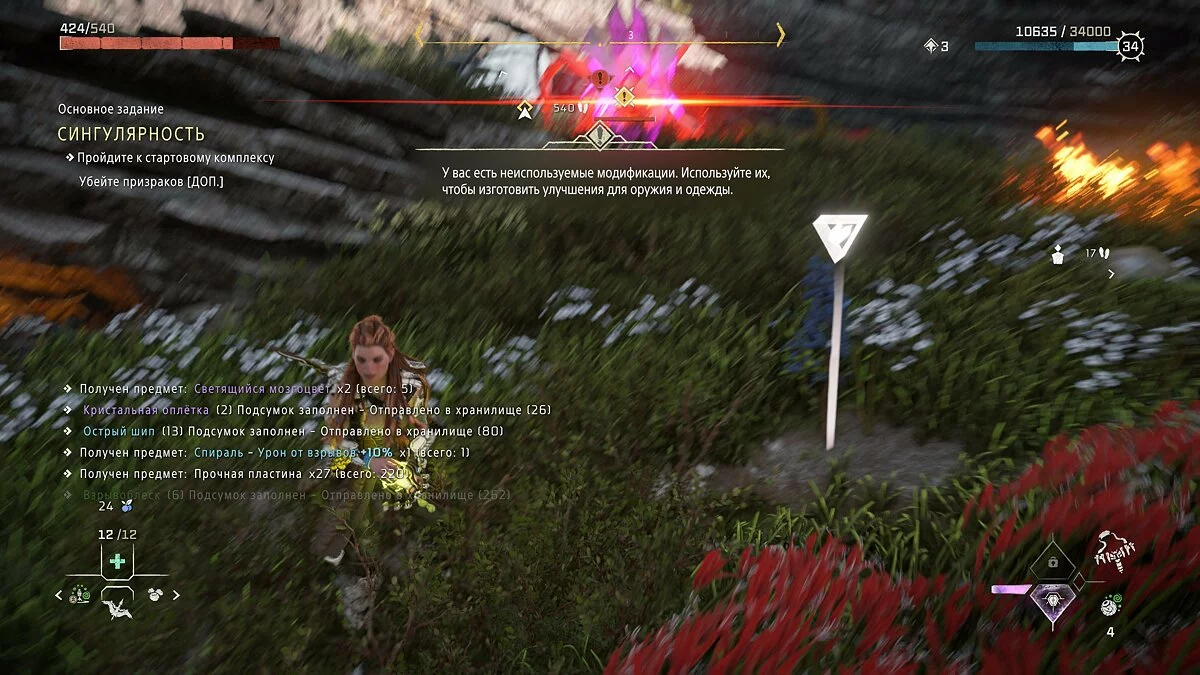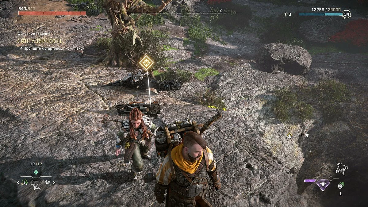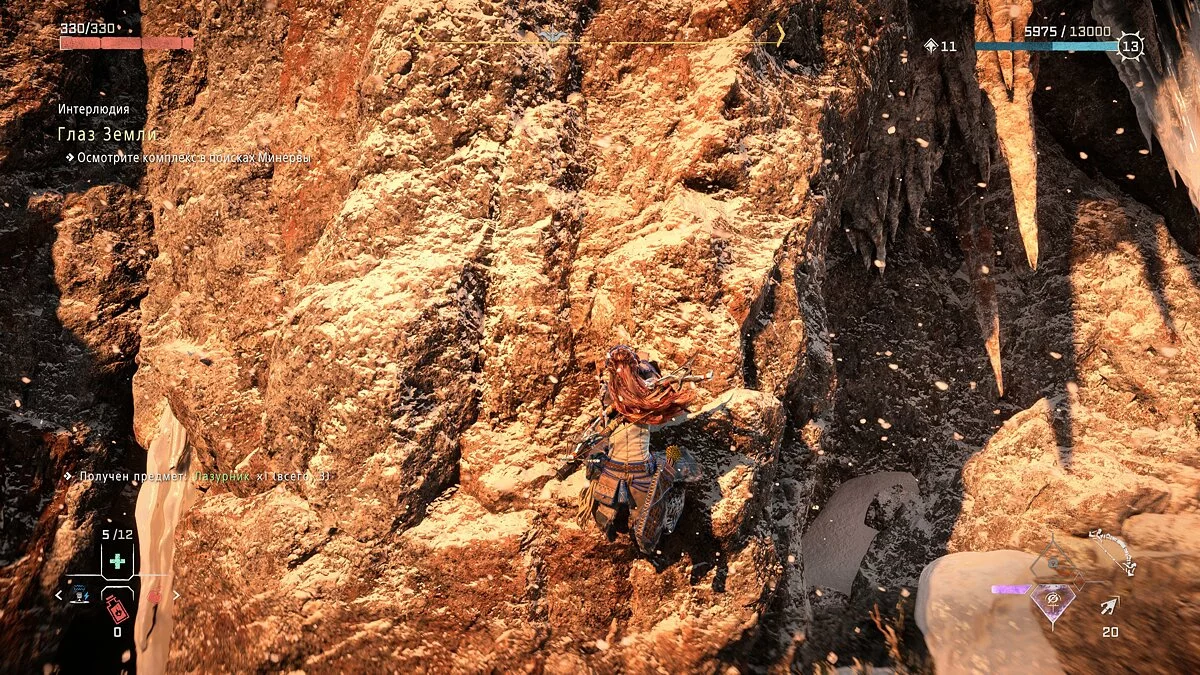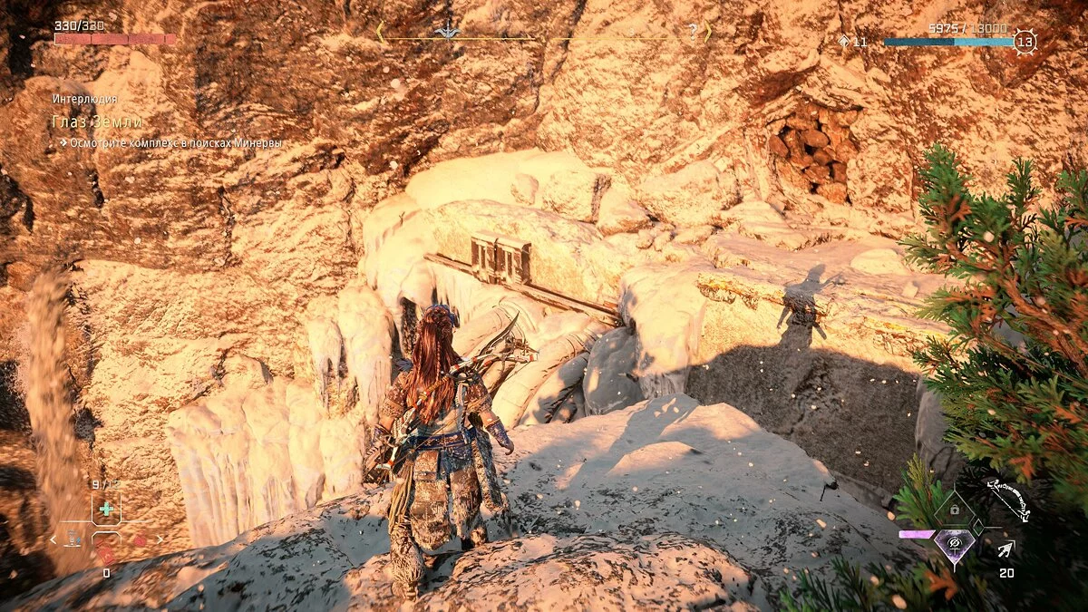Элой нужно найти Эренда и расчистить путь от агрессивных машин. Стражник советует сделать кислотные стрелы, поэтому сначала направляйтесь в Скрежет Горы и улучшить лук. Не забудьте осмотреть территорию и собрать ресурсы около подъемника.